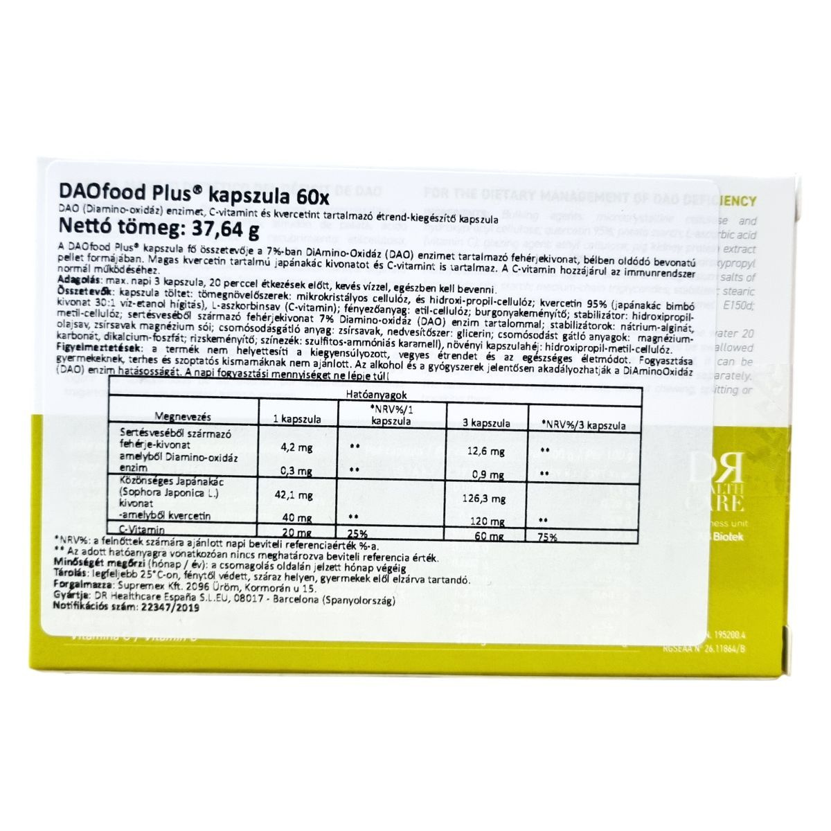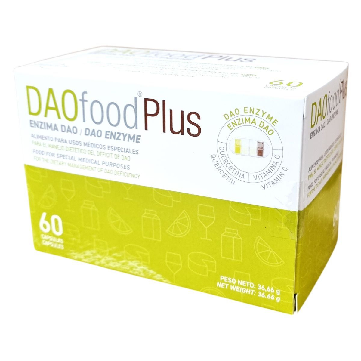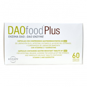 A DAOfood Plus® egy olyan étrend-kiegészítő kapszula, amely Diamino-oxidáz (DAO) enzimet, C-vitamint és kvercetint tartalmaz. A DAO enzim fehérjekivonat formájában, bélben oldódó bevonatú pelletként található meg a készítményben, amely kíméli az enzimet a gyomorsavaktól, így a vékonybélben szabadul fel. A japánakác kivonatból származó magas kvercetin és a C-vitamin támogatást nyújthat az immunrendszer számára. A termék a DAO enzimhiány étrendi kezeléséhez készült, mely esetén ajánlott csökkenteni a hisztaminban vagy más biogén aminokban gazdag élelmiszerek, különösen a tejtermékek és a citrusfélék fogyasztását, illetve kerülni az alkoholos italokat, mivel az alkohol gátolhatja a DAO enzim működését. A kapszulák használata orvosi felügyelet mellett javasolt, nem helyettesítheti a változatos és kiegyensúlyozott étrendet. A termék nem tartalmaz glutént, laktózt és hisztamint, és nem alkalmas egyedüli táplálékforrásként való alkalmazásra.
