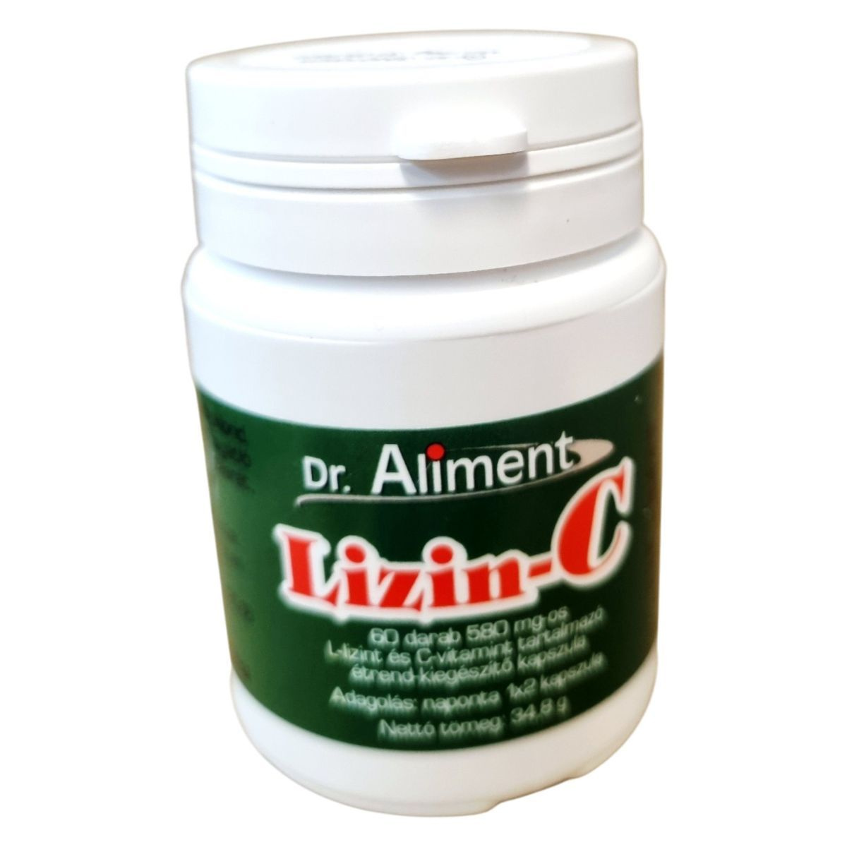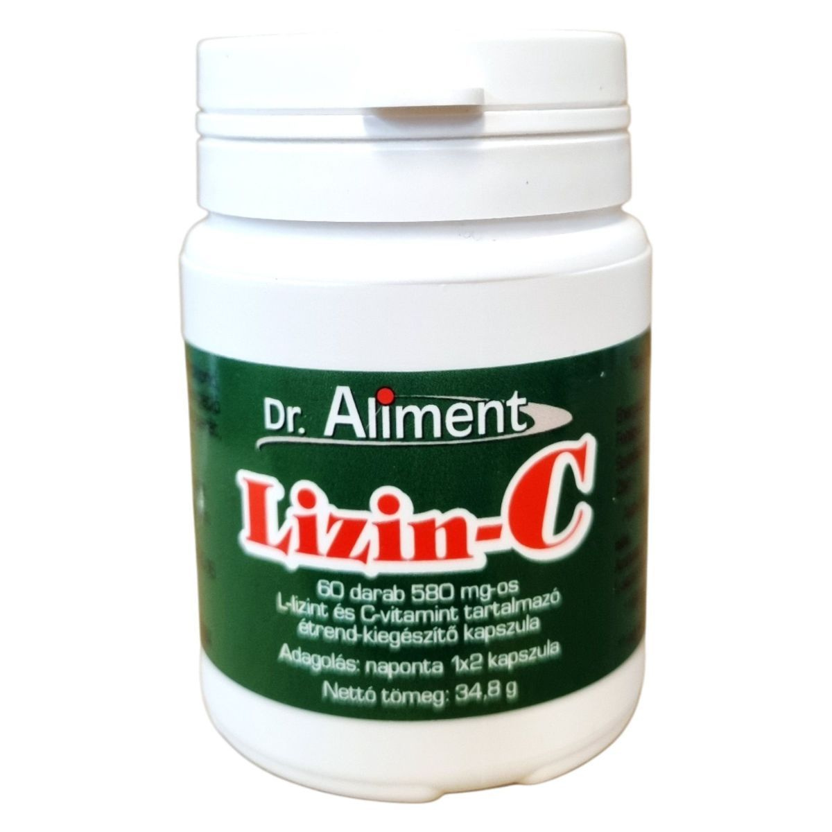 A Dr. Aliment Lizin-C kapszula egy 60 darabos, 580 mg-os kiszerelésű étrend-kiegészítő, amely kombinálja az esszenciális aminosavat (L-lizin) és a C-vitamint. A termék célja, hogy támogassa a szervezet immunrendszerét, valamint hozzájáruljon a bőr és kötőszövetek normál állapotának fenntartásához. A kapszulák nem tartalmaznak hozzáadott cukrot vagy mesterséges színezéket, és napi kétszeri fogyasztás mellett biztosítják a megadott hatóanyagbevitelt. Nettó tömeg: 34,8 g.