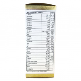 mikrokristályos cellulóz (stabilizátor), prezselatinizált keményítő, kalcium-hidrogénfoszfát, maltodextrin, karboximetil-cellulóz (térfogatnövelő), magnézium-oxid, aszkorbinsav (C-vitamin), hidroxi-propil-metilcellulóz (sűrítőanyag), zsírsavak magnézium sói (csomósodást gátló), kalcium-karbonát, kolekalciferol (D3-vitamin), d-α-tokoferil-acetát (E-vitamin), olivakivonat, niacin (B3-vitamin), Ginkgo biloba-kivonat, Panax ginseng-kivonat, vas-fumarát, cink-oxid, króm-klorid, pantoténsav (B5-vitamin), nátrium-molibdát, mangán-szulfát, Q10-koenzim, lutein, retinil-acetát (A-vitamin), likopin, piridoxin-hidroklorid (B6-vitamin), nátrium-szelenit, riboflavin (B2-vitamin), szilícium-dioxid, tiamin-nitrát (B1-vitamin), réz-szulfát, bórsav, fillokinon (K1-vitamin), cianokobalamin (B12-vitamin), folsav, kálium-jodid, biotin.