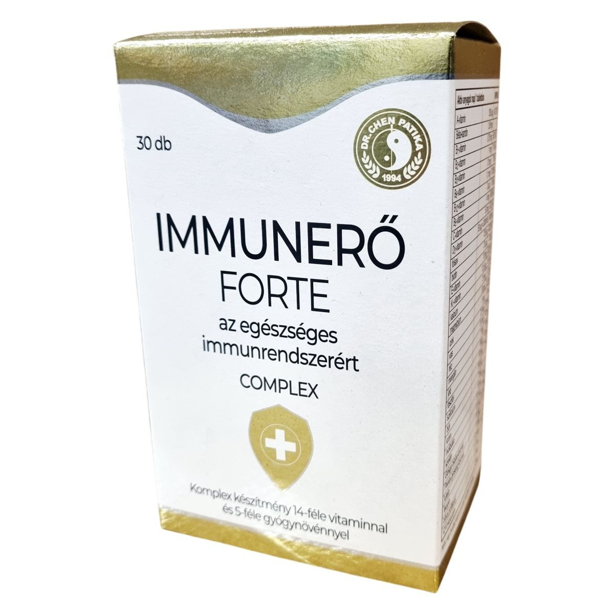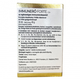 Az IMMUNERŐ FORTE C19+ egy komplex multivitamin-készítmény, amely 14-féle vitamint, ásványi anyagot, nyomelemet, valamint 5-féle gyógynövényt tartalmaz. Fő összetevői között megtalálhatóak az immunrendszer normál működését támogató A-, C-, D3-, B6-, B12-vitaminok, cink, réz, vas, szelén és folsav. A biotin az idegrendszer normál működéséhez járulhat hozzá, míg a C-, B2-, B3-, B5-, B6-vitaminok, folsav és vas csökkentheti a fáradtságot és kifáradást. A termékben magas D3-vitamin-tartalom található, amely 2000 NE adagban segítheti az immunrendszer és a csontozat támogatását. Az immunerőt komplex módon erősíthetik a Ginkgo biloba- és Panax ginseng-kivonatok, a lutein, likopin, olíva polifenol és Q10-koenzim antioxidáns együttese. A készítmény helyes gyártási gyakorlat szerint készül, amely biztosítja a minőségi előírásoknak való megfelelést. Naponta 1 tabletta fogyasztása ajánlott az optimális hatás érdekében.