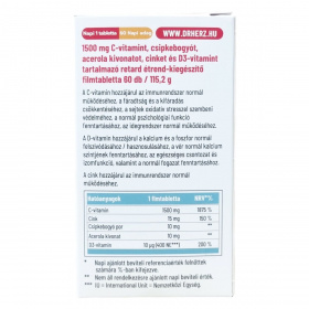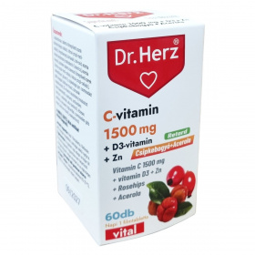 A Dr.Herz® C-vitamin retard filmtabletta 1500 mg C-vitamint, csipkebogyót, acerola kivonatot, cinket és D3-vitamint tartalmaz. A C-vitamin hozzájárulhat az immunrendszer normál működéséhez, a fáradtság és kifáradás csökkentéséhez, a sejtek oxidatív stresszel szembeni védelméhez, a normál pszichológiai funkció fenntartásához és az idegrendszer működéséhez. A D-vitamin hozzájárulhat a kalcium és foszfor normál felszívódásához, a vér normál kalciumszintjének fenntartásához, az egészséges csontozat, izomfunkció és fogazat megőrzéséhez. A cink szintén támogathatja az immunrendszer működését. A termék 60 darab filmtablettát tartalmaz, mely könnyen beilleszthető a napi étrendbe. Termékeit keresheti gyógyszertárakban és gyógynövényboltokban, amelyek között vitaminok, étrend-kiegészítők, oldatos cseppek, hidegen sajtolt olajok, természetes illóolajok és gyógynövényes krémek találhatók, különböző felhasználási területekre, például immunerősítésre, fogyókúrára, méregtelenítésre, emésztésre, szív- és érrendszer támogatására, csontrendszerre, valamint haj, bőr és köröm egészségének támogatására.