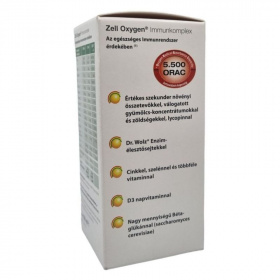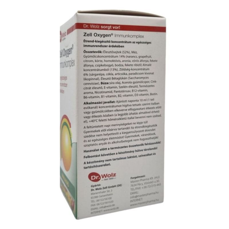 Annak érdekében, hogy az egyes anyagok immunstimuláló és antioxidáns hatásukat célzottan, a sejtek szintjén tudják kifejteni, az anyagok szinergikus formában vannak jelen, azaz közös hatásuk nagyobb, mint az egyes hatások külön-külön. A Dr. Wolz Zell Oxygen Immunkomplex készítmény természetes, biológiai alkotórészeinek átfogó kínálatából a szervezet pontosan azokat a tápanyagokat tudja felvenni, amelyek neki hiányoznak. A "mesterséges" vitaminokkal vagy az egyszeres hatóanyagokkal ellentétben a Dr. Wolz Enzim-élesztősejtek minden alkotórésze jól hasznosul a szervezetben. Egy evőkanál (10 ml) 50 milliárd Dr. Wolz Enzim-élesztősejtet tartalmaz. A készítmény nem tartalmaz glutént, laktózt zselatint, színezéket és tartósítószereket. A készítmény a természetes erjedési folyamatokból keletkező 9 % alkoholt tartalmaz! Gyermekek, várandósok, szoptatós anyák és alkoholbetegek nem fogyaszthatják! Dr.Wolz Enzim-élesztősejtek bioaktív alkotórészekkel, béta-glükánnal és létfontosságú nyomelemekkel: szelénnel, cinkkel, válogatott gyümölcsökből és zöldségkomplexekből nyert szekunder növényi anyagokkal. Összetevők: Élesztősejtek (52%), Méz, Gyümölcs- koncentrátum 14% (narancs, grapefruit, citrom, körte, homoktövis, aronia, vörös áfonya, fekete áfonya, csipkebogyó, bodza, fekete ribizli) Almalé koncentrátumból (13%), Zöldség-koncentrátum 6% (sárgarépa, cékla, articsóka, paradicsom kivonat likopinnal), Élesztő Béta-glükán (Saccharomyces cerevisiae), Búzacsíra olaj, Acerola gyümölcspor, Cink-citrát élesztő, E-vitamin, Szelén-élesztő, Természetes aroma, Nicotinamid, Pantoténsav, B12-vitamin, B6-vitamin, B1-vitamin, B2,-vitamin, D3-vitamin, Biotin. Alkalmazási javallat: Ajánlott naponta 10 - 30 ml (1 - 3 teli evőkanál) koncentrátumot hígítva tetszés szerint italban vagy gyümölcslében elkeverve elfogyasztani étkezés előtt vagy étkezés közben (a legjobb ízhatás almalével érhető el), +40°C feletti hőmérsékletű itallal bevenni nem szabad. Használat előtt jól felrázandó! Felbontást követően hűtve tárolandó!