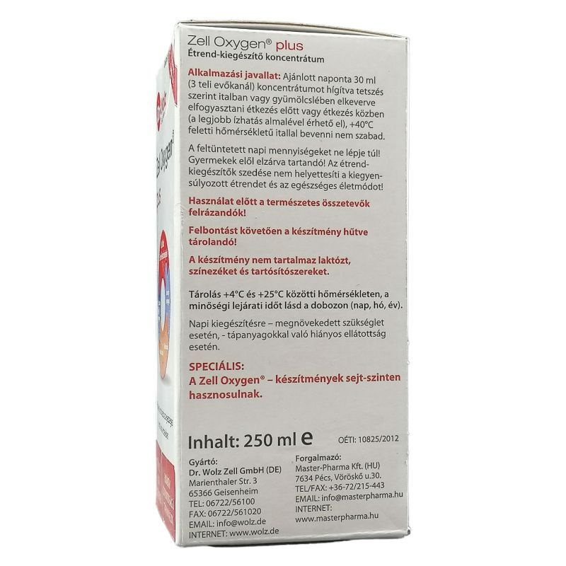 Annak érdekében, hogy az egyes anyagok vitalizáló és antioxidáns hatásukat célzottan, a sejtek szintjén tudják kifejteni, az anyagok szinergikus formában vannak jelen, azaz közös hatásuk nagyobb, mint az egyes hatások külön-külön. Egy evőkanál (10 ml) 66 milliárd Dr. Wolz Enzim-élesztősejtet tartalmaz. A Dr. Wolz Zell Oxygen Plus készítmény természetes alkotórészeinek átfogó kínálatából a szervezet pontosan azokat a tápanyagokat tudja felvenni, amelyek neki hiányoznak. A létfontosságú tápanyagokat tartalmazó Dr. Wolz Enzim-élesztősejteket, természetes úton juttatjuk a szervezetbe. Fogyasszunk minden nap egy kis pohárral az értékes enzimek gazdagságából, a sejteket ellátó és védő anyagokból, amelyek így támogatják a testi funkciókat: Védik sejtjeinket az oxidatív terheléstől, a szabad gyököktől, és támogatják a sejtek energia-anyagcseréjét. A készítmény nem tartalmaz glutént, laktózt zselatint, színezéket és tartósítószereket. A készítmény a természetes erjedési folyamatokból keletkező 12% alkoholt tartalmaz! Gyermekek, várandósok, szoptatós anyák és alkoholbetegek nem fogyaszthatják! Összetevők: Enzim-tartalmú élesztősejtek, gyümölcslé koncentrátum (narancs, ananász, grapefruit, citrom, homoktövis) almalé koncentrátumból, inaktív szárított élesztősejtek, méz, búzacsíra olaj, acerola gyümölcspor, E-vitamin, cinkélesztő, természetes aroma, szelénélesztő, nikotinamid, pantothenat, B12-vitamin, B6-vitamin, B1-vitamin, B2,-vitamin, biotin. Alkalmazási javallat: Ajánlott naponta 10 - 30 ml (1 - 3 teli evőkanál) koncentrátumot hígítva tetszés szerint italban vagy gyümölcslében elkeverve elfogyasztani étkezés előtt vagy étkezés közben (a legjobb ízhatás almalével érhető el), +40°C feletti hőmérsékletű itallal bevenni nem szabad. Használat előtt jól felrázandó! Felbontást követően hűtve tárolandó!