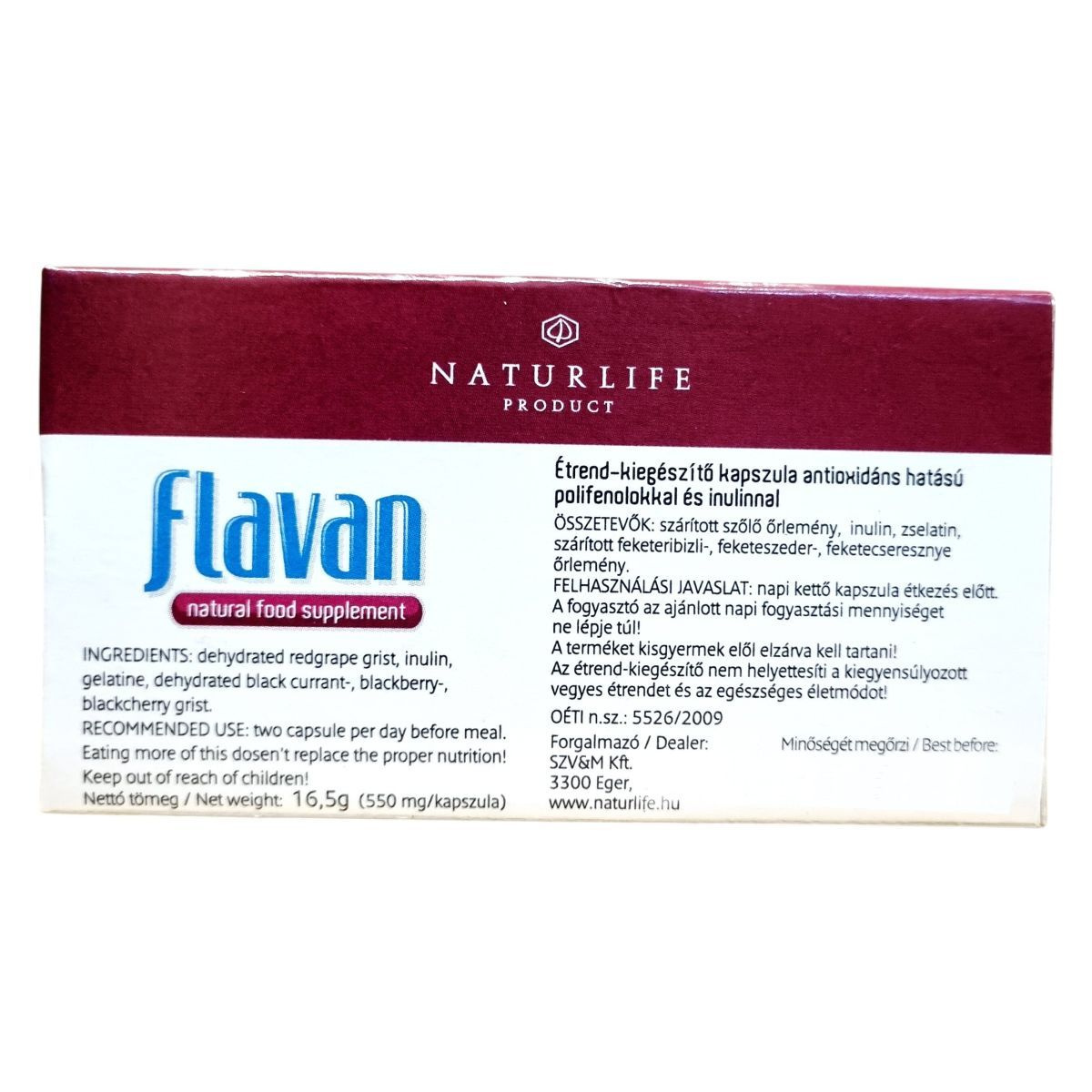 A NATURLIFE flavan étrend-kiegészítő kapszula antioxidáns hatású polifenolokat és inulint tartalmazhat, amelyek hozzájárulhatnak a szervezet védelméhez az oxidatív stressz ellen. Az összetevők között megtalálható a szárított szőlő őrlemény, inulin, zselatin, valamint szárított feketeribizli-, feketeszeder-, és feketekersesznye őrlemény. A termék napi kettő kapszula fogyasztását javasolja étkezés előtt, és figyelmeztet, hogy az ajánlott napi fogyasztási mennyiséget ne lépjük túl. A termék nem helyettesíti a kiegyensúlyozott vegyes étrendet és az egészséges életmódot, és kisgyermekek elől elzárva tartandó. Forgalmazója a SZV&M Kft., és az OÉTI engedélyszáma 5526/2009.