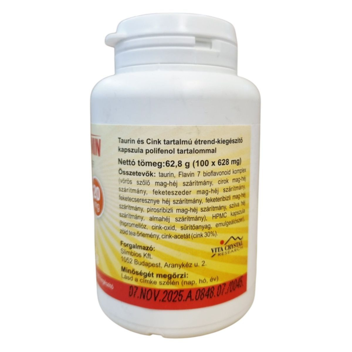 Taurin, Flavin 7 bioflavonoid komplex (vörös szőlő mag-héj szárítmány, cirok mag-héj szárítmány, feketeszeder mag-héj szárítmány, fekete cseresznye héj szárítmány, feketeribizli mag-héj szárítmány, pirosribizli mag-héj szárítmány, szilva héj szárítmány, almahéj szárítmány), HPMC kapszula (hidroxipropilmetilcellulóz), cink-oxid, sűrítőanyag, emulgeálószer, zöld tea őrlemény, cink-acetát (cink 30%).
