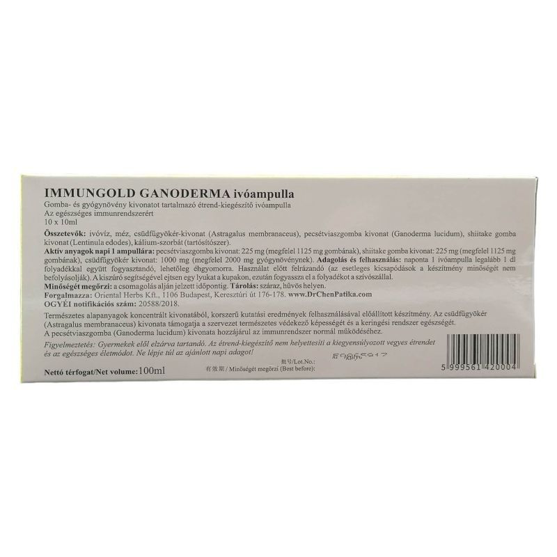 Adagolás (felhasználás): naponta 1 ivóampulla elfogyasztása javasolt. Legalább 1 dl folyadékkal együtt fogyasztandó, lehetőleg étkezés előtt. Összetevők: víz, ganoderma gomba (Ganoderma lucidum) kivonat, shiitake gomba (Lentinula edodes) kivonat, csűdfűgyökér (Asrtagalus membranaceus) kivonat, benzoesav, szorbinsav (tartósítószerek). Hatóanyagok a napi adagra, napi 1 ampullára: ganoderma gomba kivonat: 1800 mg, shiitake gomba kivonat: 1000 mg, astragalus kivonat: 500 mg. Az ajánlott napi adagot ne lépje túl! Gyermekek elől elzárva tartandó. Az étrend-kiegészítő nem helyettesíti a kiegyensúlyozott vesyes étrendet és az egészséges életmódot.