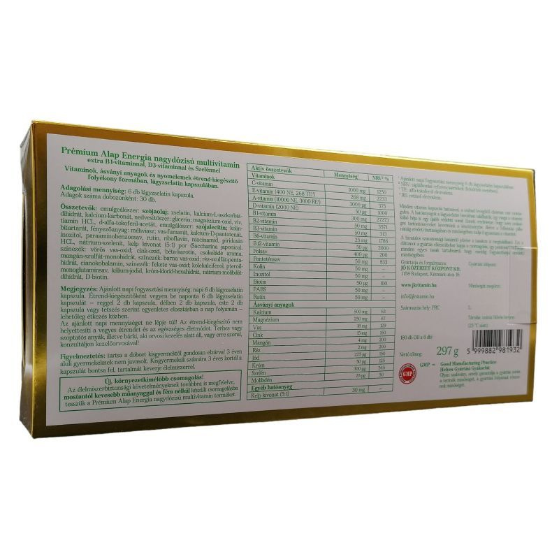 Kiknek javasoljuk a Prémium Alap Energia nagydózisú multivitamint? Akik kifejezetten normál életvitelt élnek, nincsenek nagymértékben terhelve. Milyen tulajdonságokkal rendelkezik a Prémium Alap Energia nagydózisú multivitamin? A készítmény rendkívül nagy arányban tartalmaz természetes anyagokat. Az A-vitamin sárgarépából, az E-vitamin búzacsíra olajból, a C-vitamin kukoricából és szőlőcukorból, a nyomelemek tengeri korallból vannak kivonva. Nem tartalmaz tartósítószereket, élesztőt, glutént, cukrot, sót, keményítőt, búzaszármazékot, kukoricaszármazékot, tejet, tojást. Az összetevők lágy zselatin burokba vannak zárva, teljesen pontosan egyforma mennyiségű hatóanyagot tartalmazva. Maga a burok is természetes anyag (fehérje), ezért teljes mértékben emészthető.