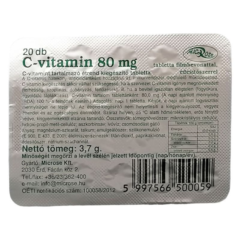 Származási hely: Magyarország. Száraz, hűvös helyen fénytől védve tartandó. OÉTI-eng. -sz.: 228/V. Összetevők: hordozók: mikrokristályos cellulóz E-460, hidroxipropil-metil-cellulóz E-464, magnézium-sztearát E-470b, szilícium-dioxid E-551; C-vitamin; titán-dioxid E-171, narancssárga FCF E-110; aromák; édesítőszer: nátrium-szacharinát E-952. Allergia info: Nem tartalmaz allergén összetevőt.