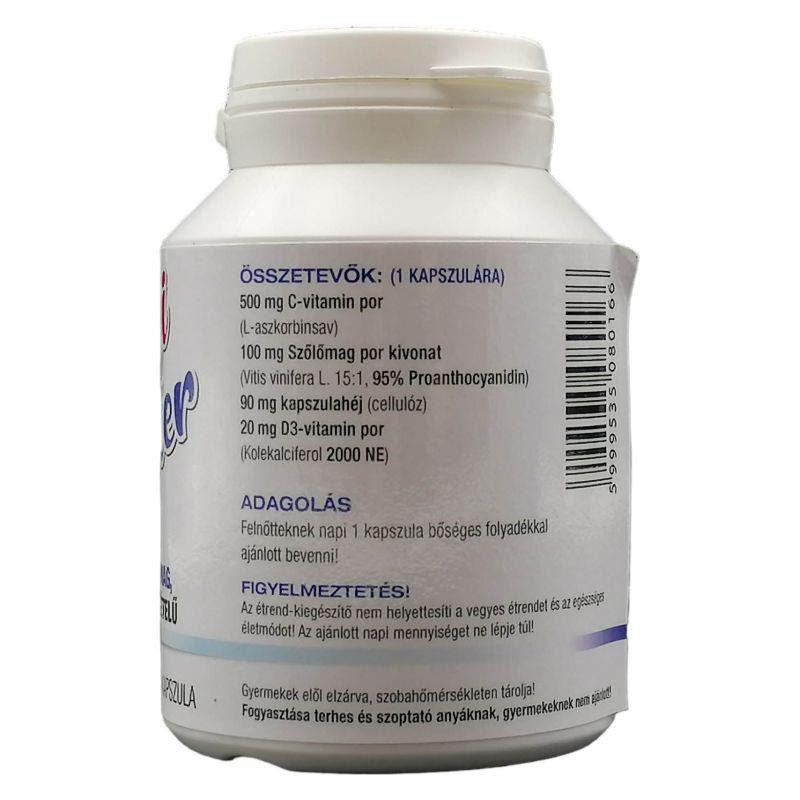 Összetétel 1 kapszulára: C-vitamin: 500 mg, szőlőmag kivonat (OPC antioxidánssal): 100 mg, D3-vitamin: 20 mg/2000 NE.