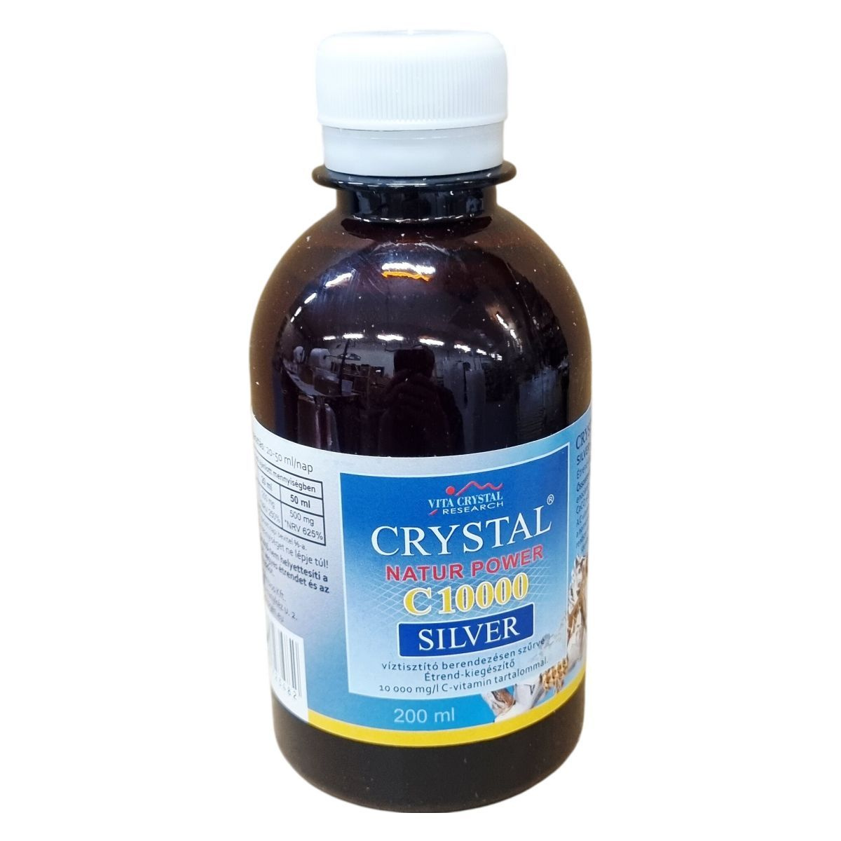 A VITA CRYSTAL CRYSTAL® NATUR POWER C10000 SILVER egy víztisztító berendezésen szűrt, C-vitaminban gazdag étrend-kiegészítő. A termék 10 000 mg/l C-vitamint tartalmaz, amely hozzájárulhat a fáradtság csökkentéséhez, a normál energetikai folyamatokhoz, az immunrendszer működéséhez és a sejtek védelméhez az oxidatív stresszel szemben. Az összetevői között megtalálhatóak a szűrt, tisztított víz, ascorbinsav, természetes enocianin színezék, Sango Mineral Powder mint ásványi anyagforrás, valamint borsmenta. A termék 200 ml-es kiszerelésben érhető el, és ajánlott napi fogyasztása 20-50 ml, amelynek hatóanyag-összetétele jól átlátható. A terméket szárazon, hűvös és fénytől védett helyen kell tárolni, és fogyasztás előtt fel kell rázni.