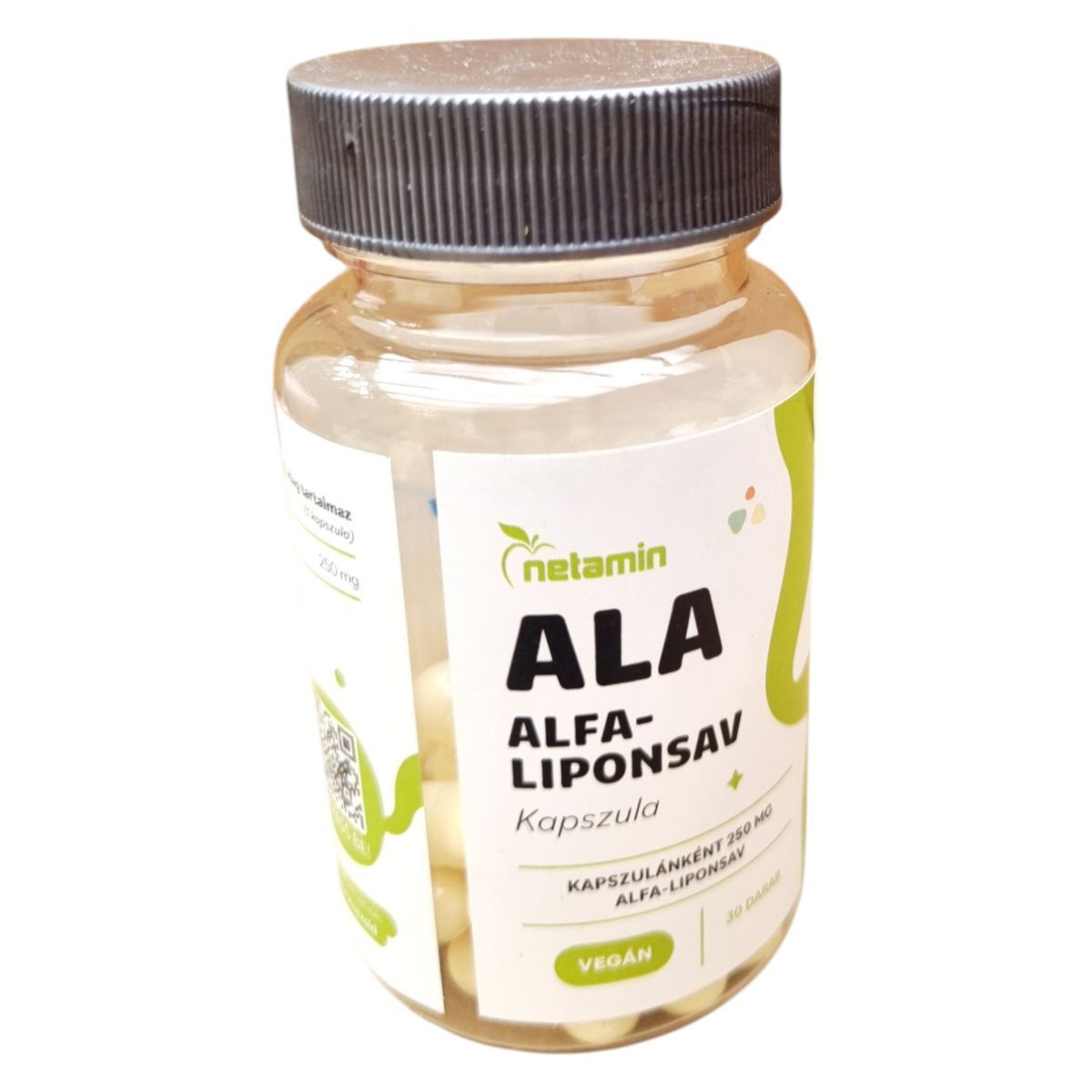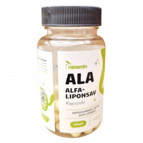 A Netamin Alfa-liponsav kapszula egy 100% vegán étrend-kiegészítő, amely kapszulánként 250 mg alfa-liponsavat tartalmaz. Az alfa-liponsav antioxidáns tulajdonságai révén hozzájárulhat a szervezet egészségének támogatásához. A termék mikrokristályos cellulózt és növényi kapszulahéjat tartalmaz, és csomósodást gátló anyagokkal van kiegészítve. A kapszulák napi egy alkalommal, lehetőleg két étkezés között javasoltak. Fontos, hogy az ajánlott napi adagot ne lépje túl, és az étrend-kiegészítő nem helyettesíti a vegyes étrendet és az egészséges életmódot. A terméket száraz, sötét, hűvös helyen kell tárolni, és gyermekek elől elzárva tartani. A terméket a Natural Herbal Kft. forgalmazza.