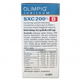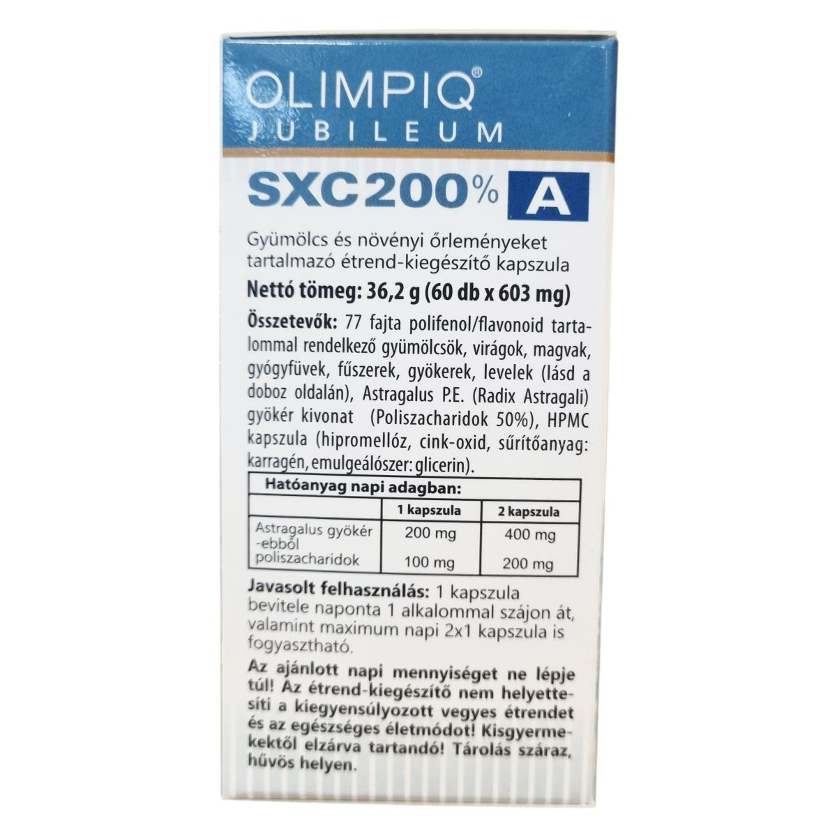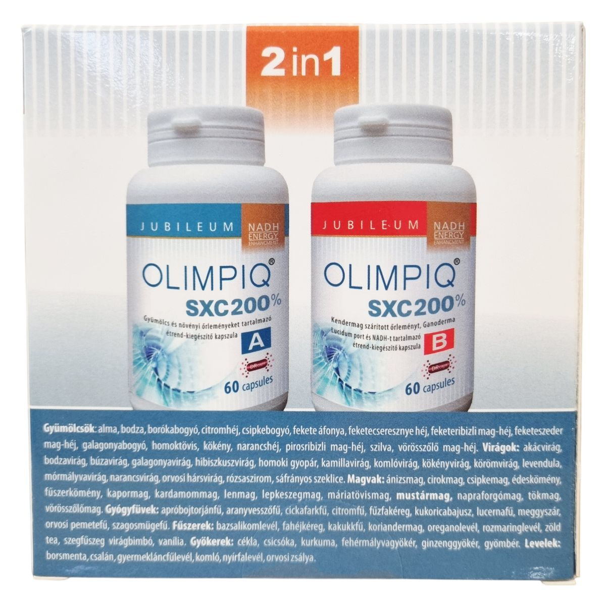 Az Olimpiq SXC200% A+B két külön kapszulából álló étrend-kiegészítő rendszer. Az A kapszula gyümölcsök és növényi őrlemények komplex keverékét és Astragalus gyökér kivonatot tartalmaz, míg a B kapszula kendermag, Ganoderma Lucidum, NADH, koenzim Q10, L-arginin és egyéb növényi komponensek kombinációja. A termék DR kapszulázással készült (Delayed Release Capsules). Nettó tömeg: 2 x 36,2 g (60 db x 603 mg kapszula).