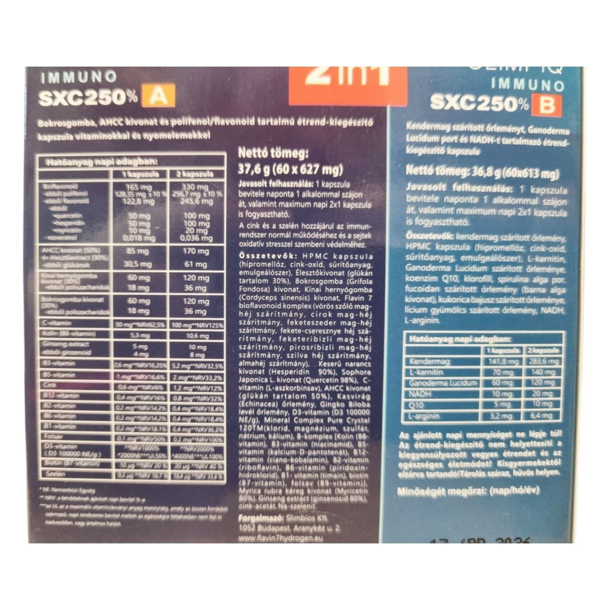 HPMC kapszula (hipromellóz, cink-oxid, sűrítőanyag, emulgeálószer), Élesztőkivonat (glükán tartalom 30%), Bokrosgomba (Grifola frondosa) kivonat, Kínai hernyógomba (Cordyceps sinensis) kivonat, flavonoid komplex (vörös szőlő mag-héj szárítmány, citrusfélék héj szárítmány, fekete-cseresznye mag-héj szárítmány, fekete ribizli mag-héj szárítmány, szilva héj szárítmány)