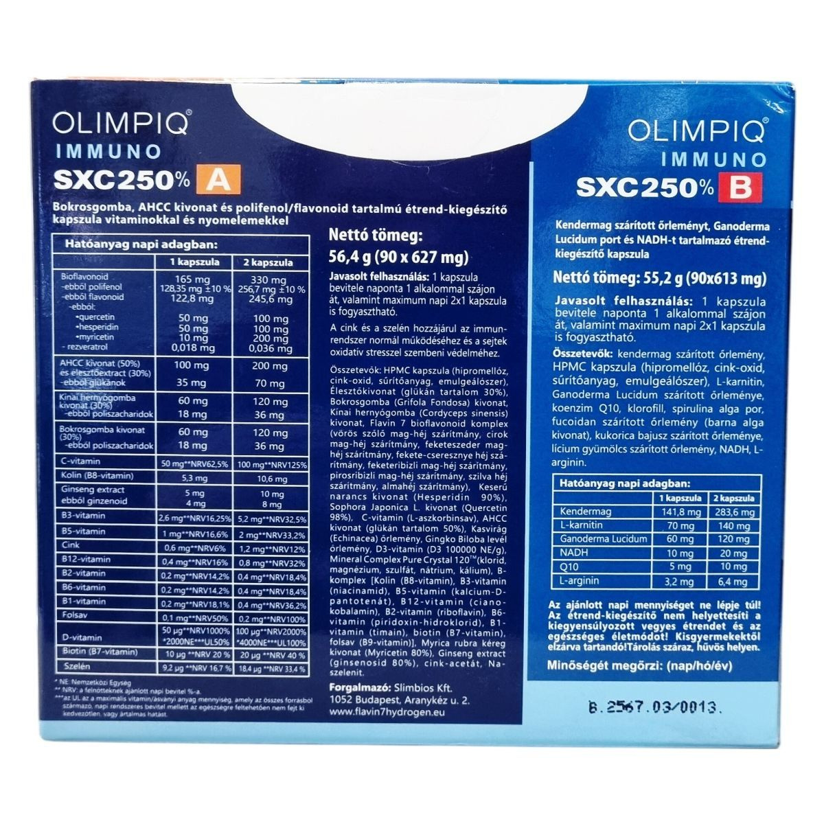 IMMUNO. NADH ENERGY ENHANCMENT. DOUBLE DEFENSE. OLIMPIQ IMMUNO protection complex. Nettó tömeg A: 56,4 g (90 x 627 mg). Nettó tömeg B: 55,2 g (90 x 613 mg). 2x90 pcs.