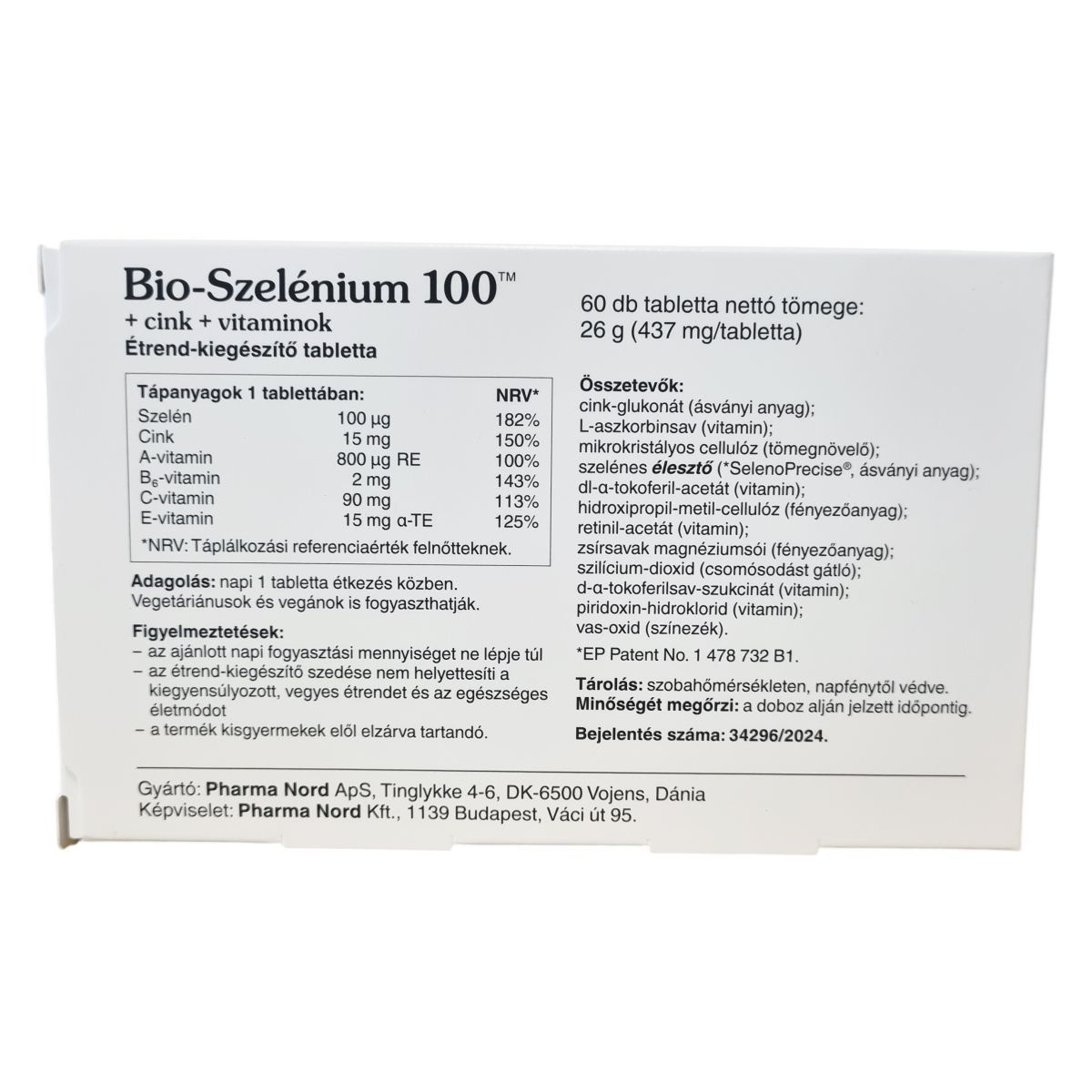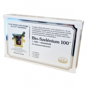 A Bio-Szelénium 100™ + cink + vitaminok tabletta gyógyszergyártási gyakorlat szerint előállított és ellenőrzött étrend-kiegészítő, melyet Pharma Nord gyárt. A szelén a SelenoPrecise® márkanevet viseli, amely szabadalmaztatott szelénes élesztő alapanyag. A készítmény vegánok és vegetáriánusok számára is alkalmas. A termék tablettánként 437 mg-os tömegű, 60 tablettás kiszerelésben kapható, nettó tömege 26 g. A készítmény a szelén mellett cinket és az immunrendszer támogatásáért fontos A-, B6-, C- és E-vitaminokat tartalmaz, melyek hozzájárulhatnak az immunrendszer normál működéséhez, valamint az oxidatív stressz elleni védelemhez. A szelén szerepet játszhat a normál pajzsmirigy-működésben is. A termék tárolása szobahőmérsékleten, napfénytől védve ajánlott. A minőségmegőrzési időpont a doboz alján feltüntetett időpontig garantált.