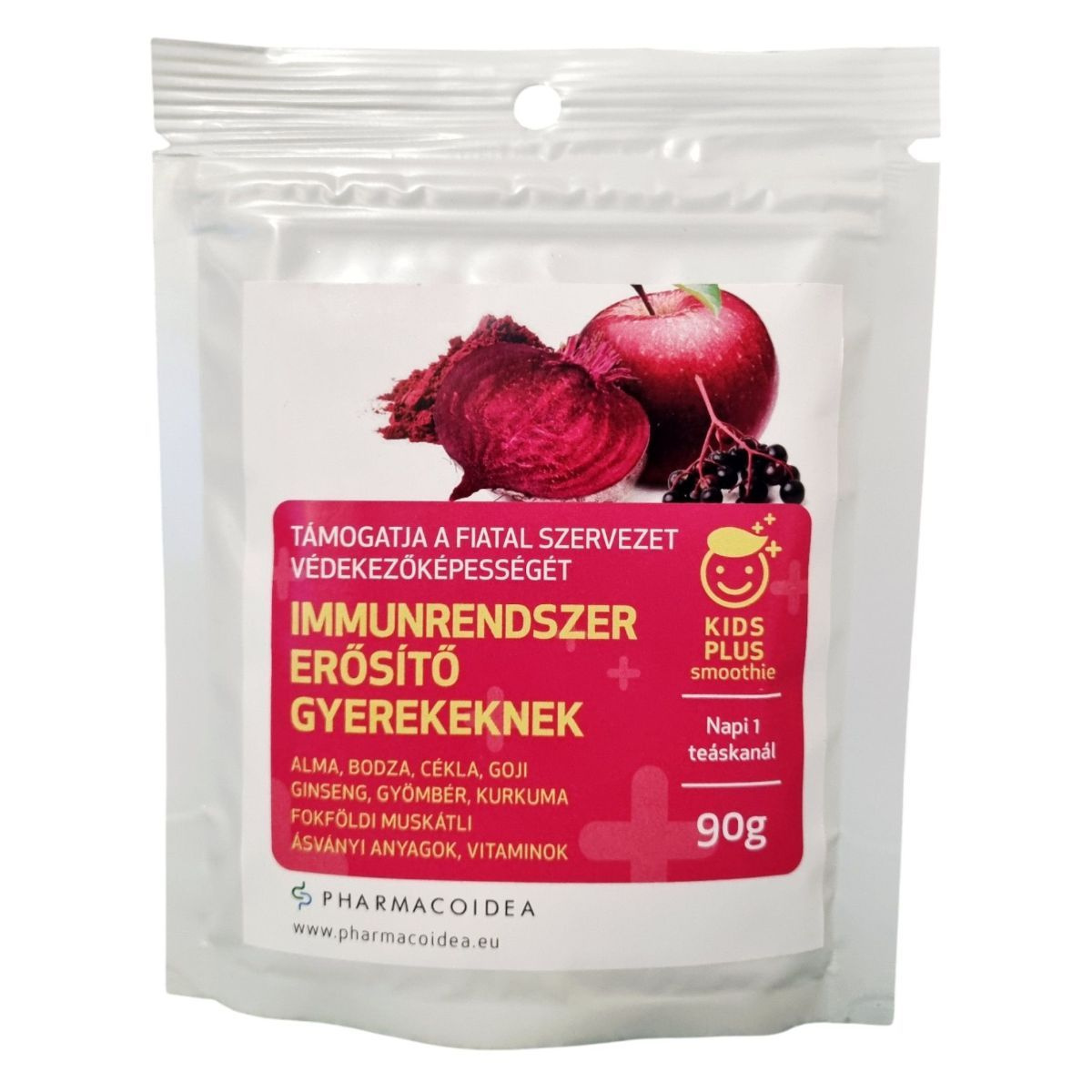 A Pharmacoidea Kids Plus smoothie egy gyermekek számára készült étrend-kiegészítő porkeverék, amely különféle természetes összetevőket tartalmaz, mint az alma, bodza, cékla, goji, ginseng, gyömbér, kurkuma és fokföldi muskátli. Ezek az összetevők hozzájárulhatnak az immunrendszer normál működéséhez, a légzőrendszer egészséges működéséhez, valamint a gyermekek egészséges fejlődéséhez. A termék napi ajánlott mennyisége 3 g, amelyet gyümölcslébe, joghurtba vagy tejbe keverve javasolt fogyasztani. A termék nem helyettesíti a kiegyensúlyozott étrendet és az egészséges életmódot.