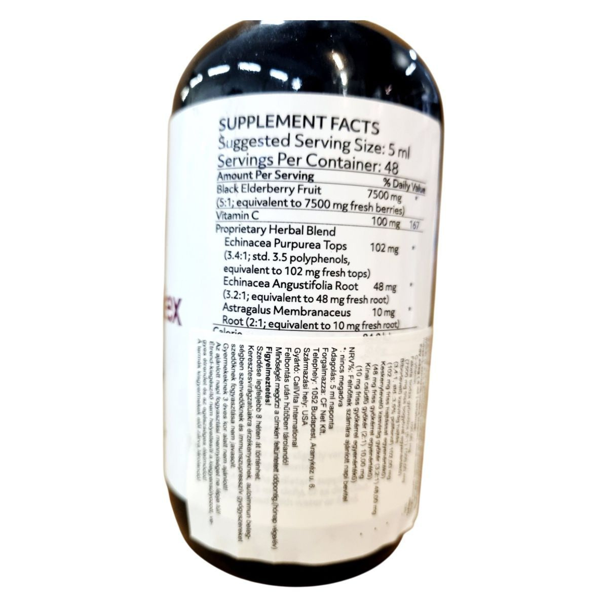 bodza (5:1) (7500 mg), C-vitamin (aszkorbinsav) 100 mg, bíbor kasvirág hajtás (3,4:1; std. 3,5 polifenol) 102 mg, keskenylevelű kasvirág gyökér (3,2:1) 48 mg, kínai csüdfű gyökér (2:1) 10 mg