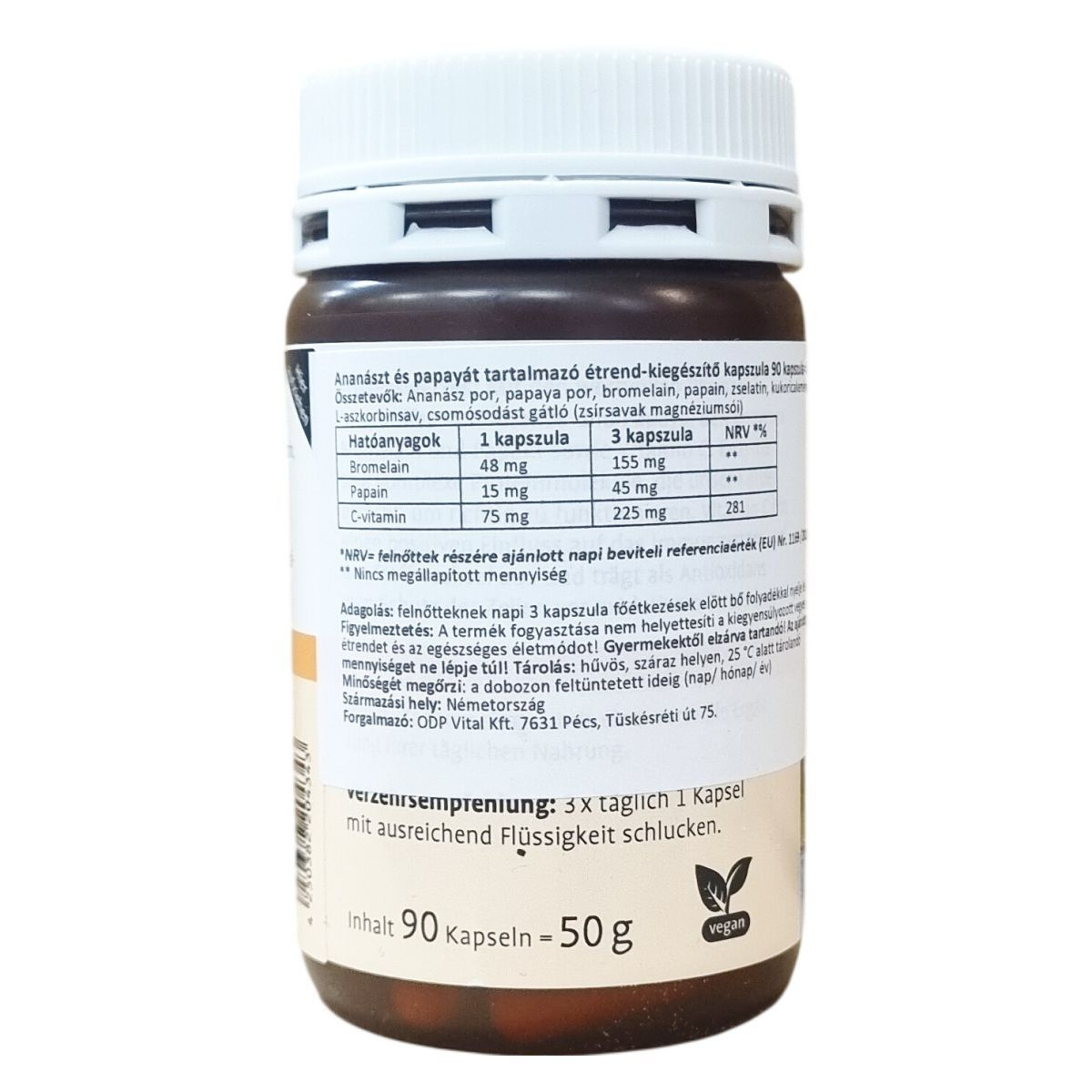 kukoricakeményítő, ananász por, papaya por, hidroxi-propil-metil-cellulóz, C-vitamin, bromelain, maltodextrin, papain, csomósodást gátló (zsírsavak magnéziumsói), magnézium-sztearát
