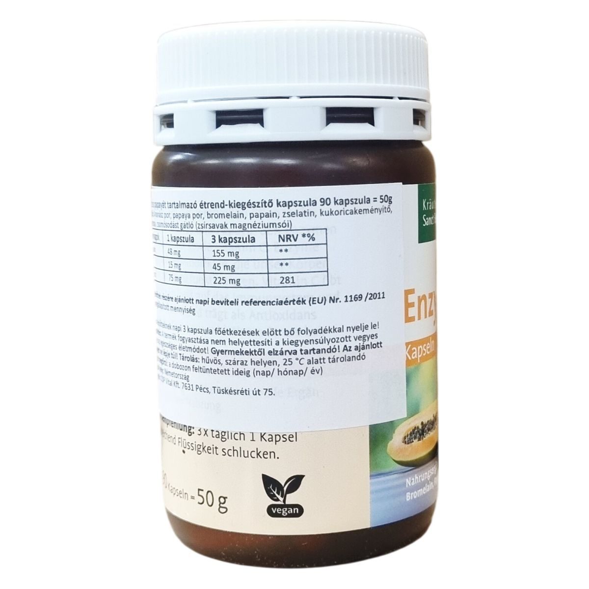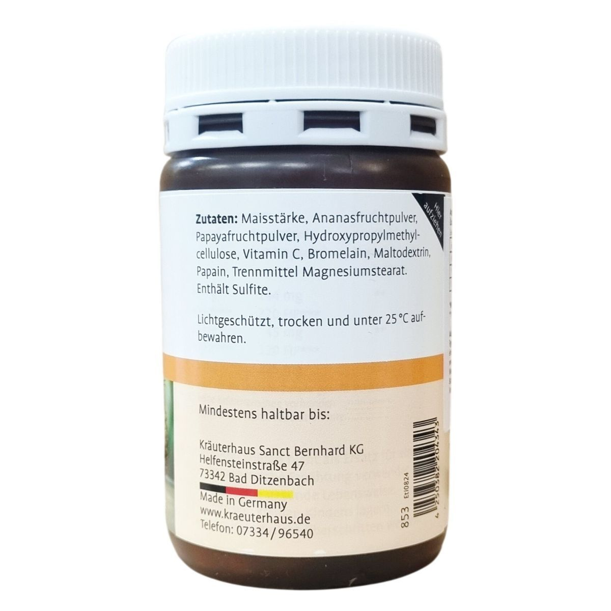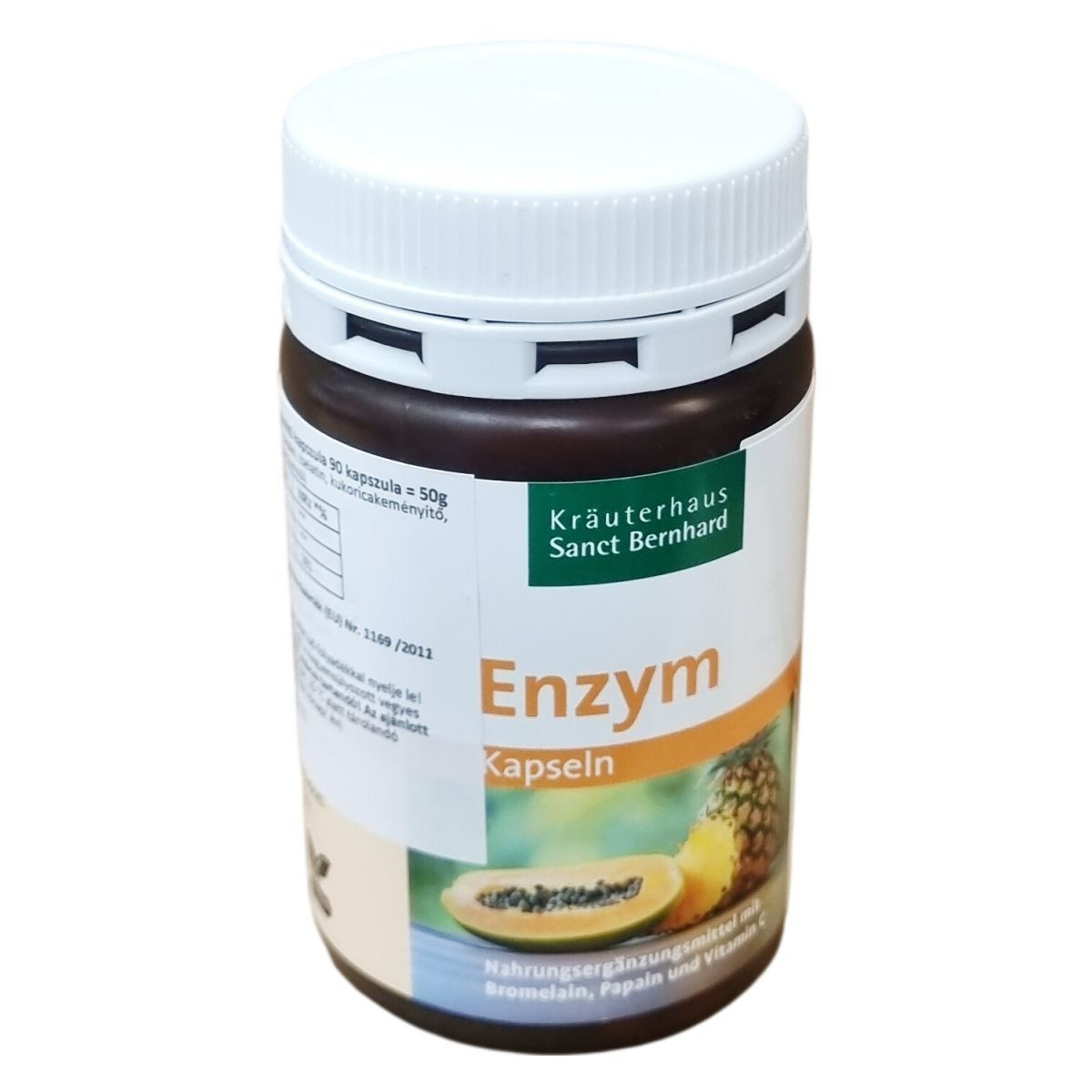 A Kräuterhaus Sanct Bernhard Enzym kapszula egy ananászt és papayát tartalmazó étrend-kiegészítő, mely bromelain, papain és C-vitamin kombinációját kínálja. A készítmény Németországban készül, és összetevői között megtalálhatók a természetes gyümölcsporok mellett növényi alapú kapszulahéj és csomósodásgátló anyagok. A termék teljes tömege 50 gramm, 90 kapszulát tartalmaz, ami napi 3 kapszula fogyasztását javasolja főétkezések előtt. A készítményt szigorúan szobahőmérséklet alatt, száraz és fénytől védett helyen kell tárolni. A termék szulfitokat tartalmaz, ezért figyelmet igényelhet allergiás egyéneknél. A forgalmazás Magyarországon az ODP Vital Kft. által történik.