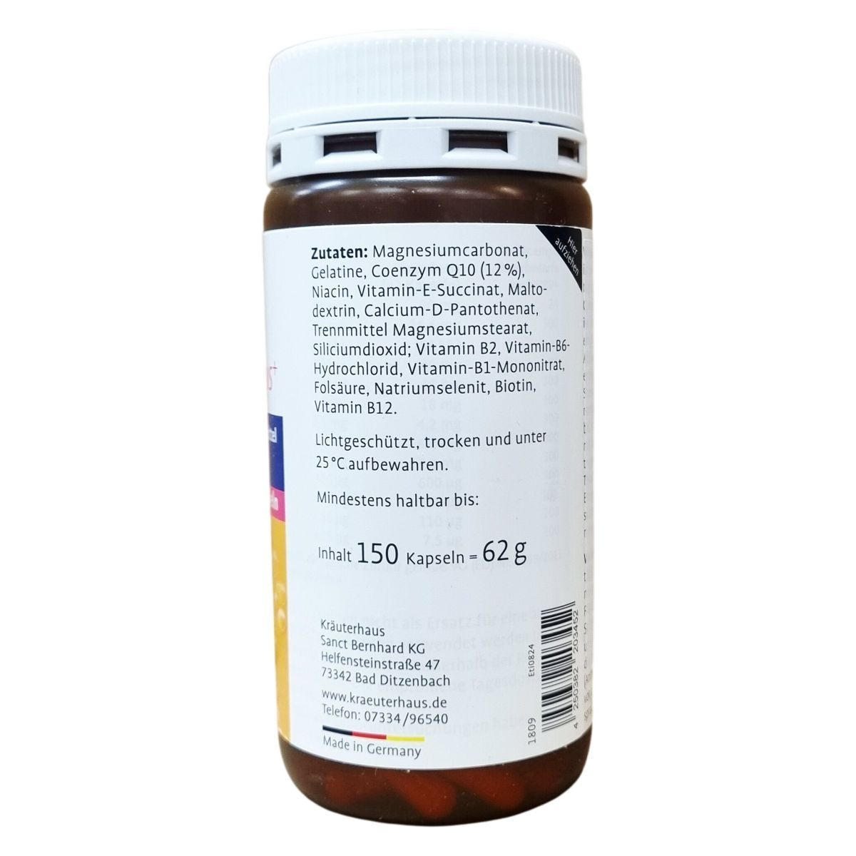 Magnézium-karbonát, zselatin, koenzim Q10 (12%), niacin, E-vitamin-szukcinát, maltodextrin, kalcium-D-pantotenát, csomósodást gátló magnézium-sztearát, szilícium-dioxid, B2-vitamin, B6-vitamin-hidroklorid, B1-vitamin-mononitrát, folsav, nátrium-szelenit, biotin, B12-vitamin.