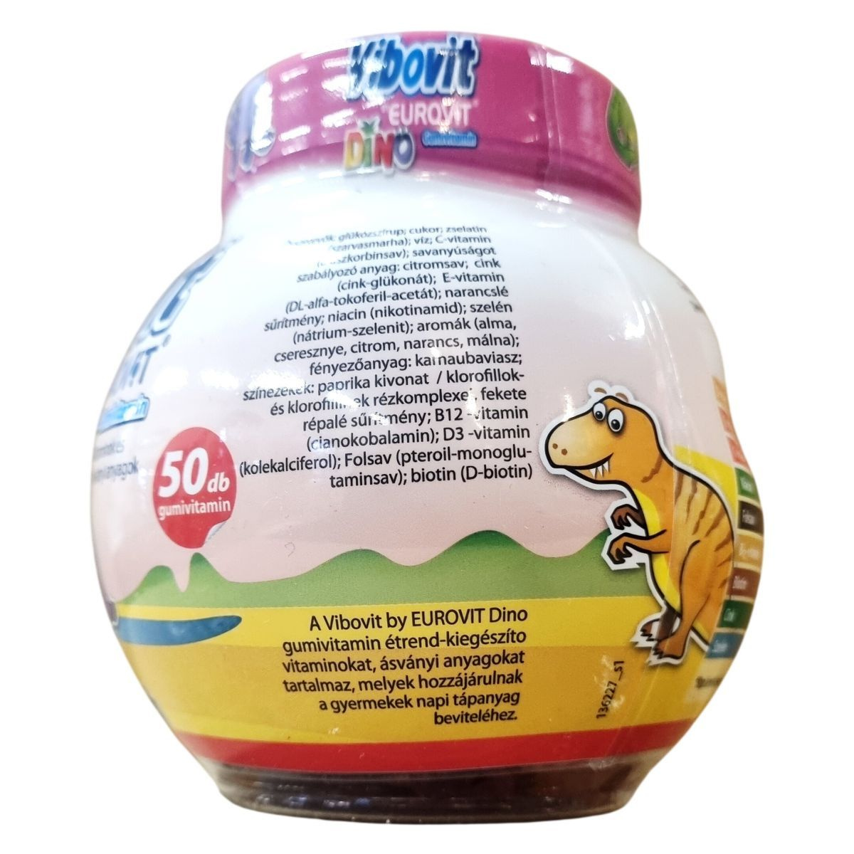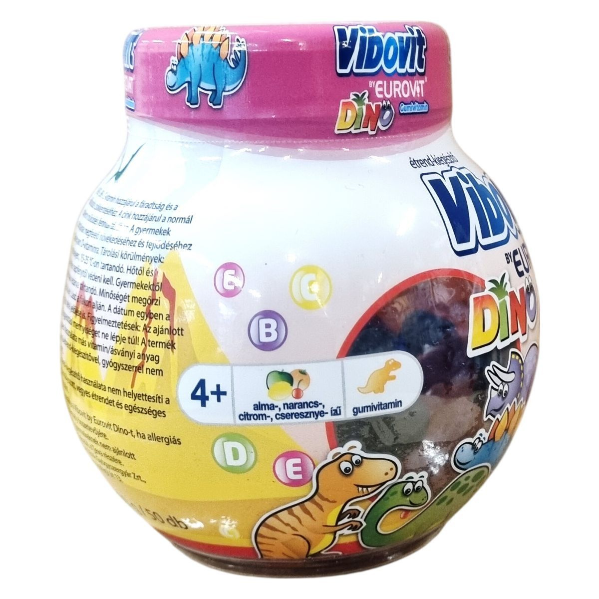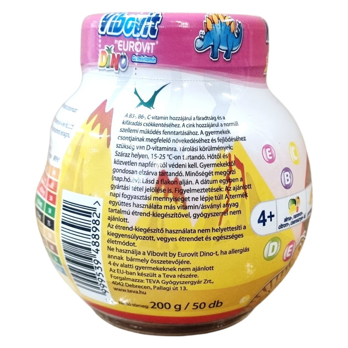 A Vibovit by EUROVIT DINO gumivitamin 4 év feletti gyermekek és felnőttek számára készült, alma-, narancs-, citrom- és cseresznye ízesítésben. A termék B3-, B6- és C-vitaminokat tartalmaz, amelyek hozzájárulhatnak a fáradság és a kifáradás csökkentéséhez, valamint cinket, amely segítheti a normál szellemi működés fenntartását. A D-vitamin szerepet játszik a gyermekek csontjainak megfelelő növekedésében és fejlődésében. A gumivitamin egy olyan étrend-kiegészítő, amely vitaminokat és ásványi anyagokat biztosít a szervezet számára, támogatva a mindennapi tápanyagigényt, és segítheti a kiegyensúlyozott táplálkozást. Az EU-ban készült a Teva részére, nettó tömege 200 g (50 db gumivitamin).