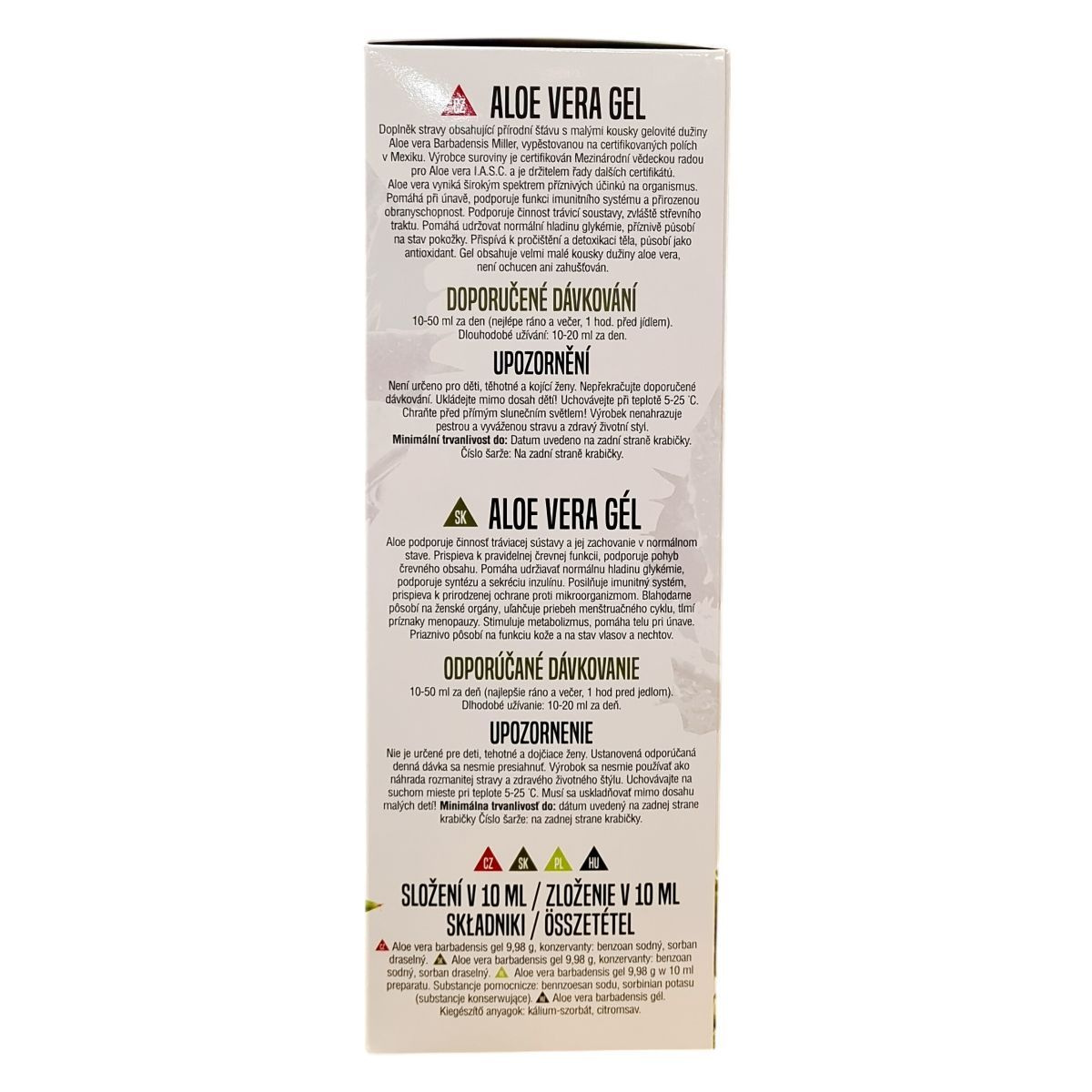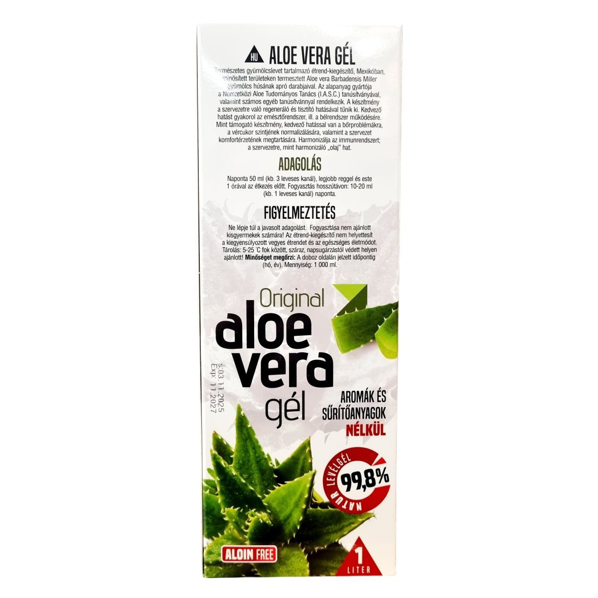 Az aloe vera gél természetes gyümölcslévet tartalmaz apró darabokkal a Mexikóban, minősített földeken termesztett Aloe vera Barbadensis Miller növényből. A gyártó rendelkezik a Nemzetközi Aloe Tudományos Tanács (I.A.S.C.) tanúsítványával, amely a minőség és eredet igazolására szolgál. A gélt a szervezet regenerálásának és tisztításának támogatására fejlesztették ki; elősegítheti az emésztőrendszer, különösen a bélrendszer működésének támogatását, valamint hozzájárulhat a normál vércukorszint fenntartásához. A termék kedvező hatással lehet a bőr állapotára, valamint támogatást nyújthat az immunrendszer harmonizálásában és ellenálló képességének fenntartásában. A gél nem tartalmaz aromákat, sűrítőanyagokat, illetve aloint, így tiszta hatóanyag-forrásként alkalmazható. Felhasználása során figyelembe kell venni, hogy nem gyermekek, terhes vagy szoptató nők számára készült. A fogyasztás során az ajánlott napi dózist nem szabad túllépni, és a termék nem helyettesíti a kiegyensúlyozott étrendet és az egészséges életmódot.