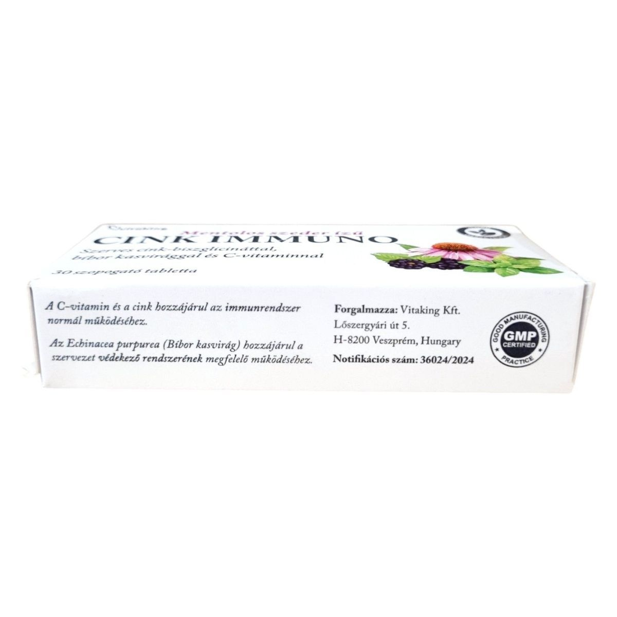A Vitaking CINK IMMUNO szopogató tabletta mentolos szeder ízű, és szerves cink-biszglicináttal, bíbor kasvirággal és C-vitaminnal készült. A C-vitamin és a cink hozzájárulhat az immunrendszer normál működéséhez, míg az Echinacea purpurea (bíbor kasvirág) támogathatja a szervezet védekező rendszerének megfelelő működését. A termék 30 tablettát tartalmaz, és édesítőszerrel készült. A napi ajánlott mennyiséget ne lépje túl, és terhesség, valamint szoptatás alatt nem ajánlott a fogyasztása.