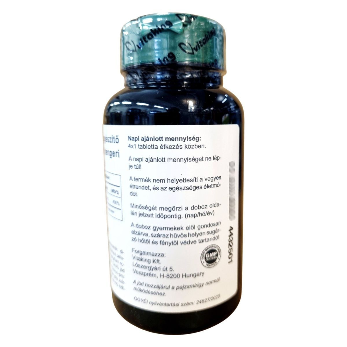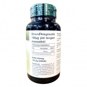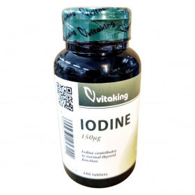 A Vitaking IODINE étrend-kiegészítő 240 tablettát tartalmaz, melyek mindegyike 150µg jódot biztosít tengeri moszatból. A jód hozzájárulhat a pajzsmirigy normál működéséhez, ami fontos lehet a szervezet hormonális egyensúlyának fenntartásában. A termék emulgeálószereket, stabilizátort és fényvédőanyagot is tartalmaz, hogy biztosítsa a tabletták stabilitását és hatékonyságát. A termék minőségét a doboz oldalán jelzett időpontig őrzi meg, és fontos, hogy a tárolási útmutatót betartva, gyermekektől elzárva, száraz, hűvös helyen tartsuk.