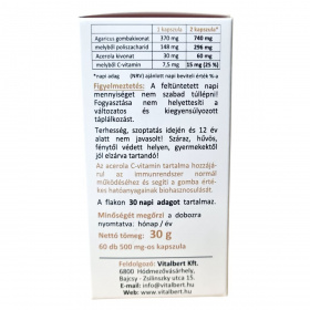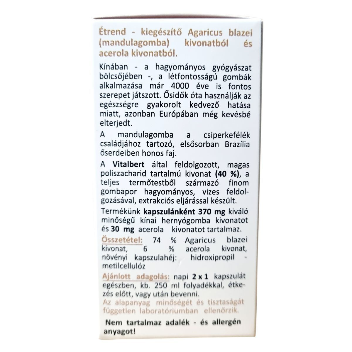 Agaricus blazei kivonat, acerola kivonat, növényi kapszulahéj (hidroxipropil-metilcellulóz)