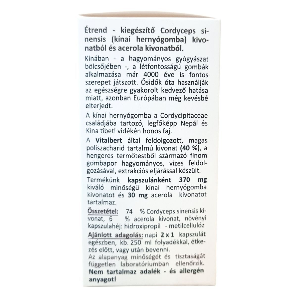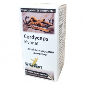 A Cordyceps sinensis nevű kínai hernyógomba a Cordycipitaceae családba tartozik, főként Nepál és Kína tibeti vidékén honos. Hagyományos kínai gyógyászatban már több ezer éve alkalmazzák, bár Európában még kevéssé ismert. A Vitalbert termék magas, 40%-os poliszacharid tartalmú kivonattal készül, mely a gomba hengeres termőtestéből származó finom por hagyományos vizes extrakciós eljárással előállított koncentrátuma. A készítmény kapszulánként 370 mg minőségi gombakivonatot és 30 mg acerola kivonatot tartalmaz, az utóbbi hozzájárulhat a C-vitamin bevitelhez, amely segítheti a gomba értékes hatóanyagainak felszívódását. Az alapanyag minőségét és tisztaságát független laboratóriumban ellenőrzik. A csomagolás 60 kapszulát tartalmaz, amely 30 napi adagnak felel meg. A termék vegán, glutén-, laktóz- és színezékmentes, valamint nem tartalmaz tartósítószert vagy egyéb adalékanyagot.
