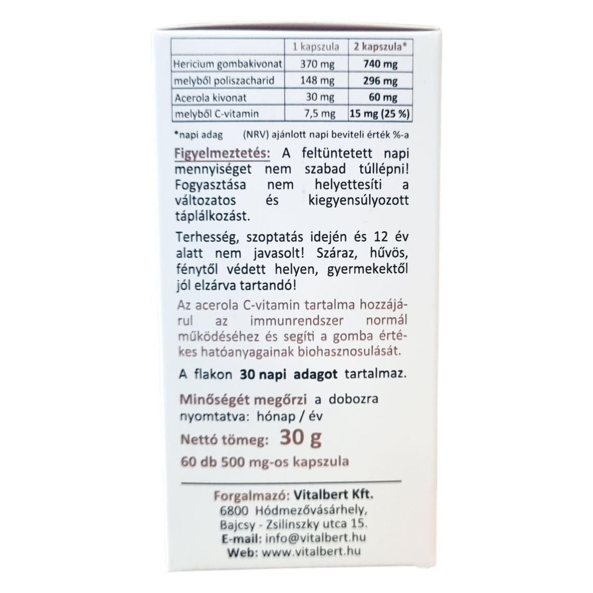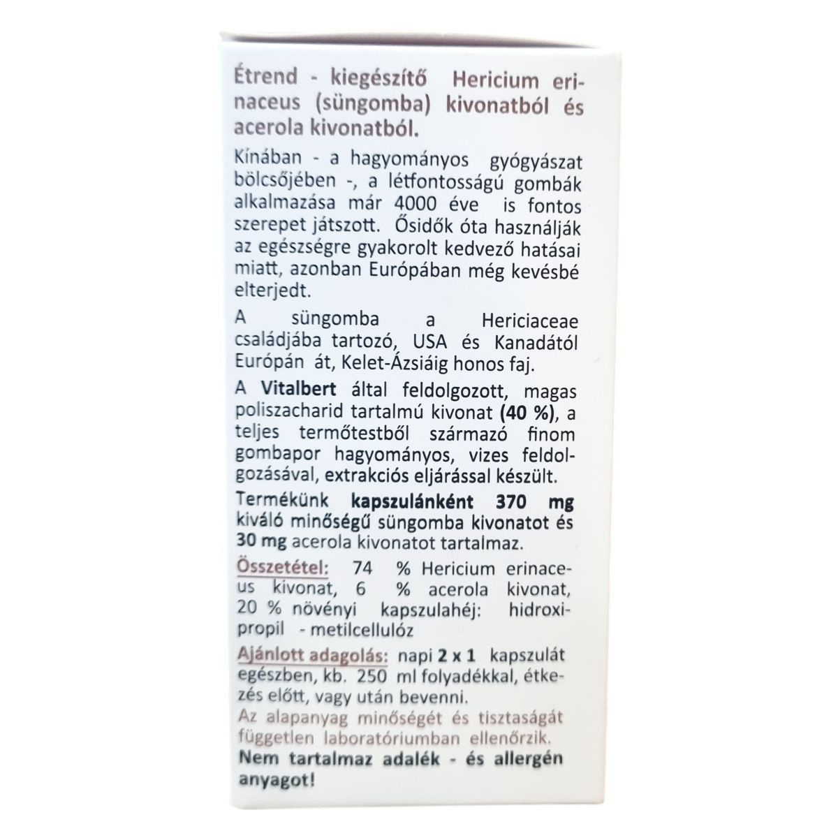 A Hericium erinaceus, ismertebb nevén süngomba, a Hericiaceae családba tartozó gombafaj, mely Észak-Amerikától Kelet-Ázsiáig honos. Kínában 4000 éve használják a hagyományos gyógyászatban kedvező hatásaiért, bár Európában még kevésbé ismert. A Vitalbert terméke a teljes termőtestből készült magas poliszacharid tartalmú (40%) kivonatot tartalmazza, amely vízalapú extrakcióval készül. A készítmény kapszulánként 370 mg süngomba és 30 mg acerola kivonatot tartalmaz, az acerola C-vitamin tartalma hozzájárulhat az immunrendszer normál működéséhez és segítheti a gomba hatóanyagainak biohasznosulását. A termék 60 db 500 mg-os kapszulát tartalmaz, amelyből kb. 30 napi adagot lehet bevenni. A készítmény nem tartalmaz GMO-t, tartósítószert, színezéket vagy más adalék- és allergén anyagokat, minőségét független laboratóriumi vizsgálatok igazolják.