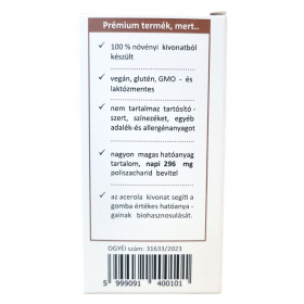 Ez a vegán étrend-kiegészítő magas poliszacharid tartalmú Hericium erinaceus (süngomba) kivonatot és acerola kivonatot tartalmaz, melyek segíthetik az immunrendszer támogatását és hozzájárulhatnak a hatóanyagok biohasznosulásához.