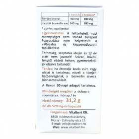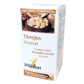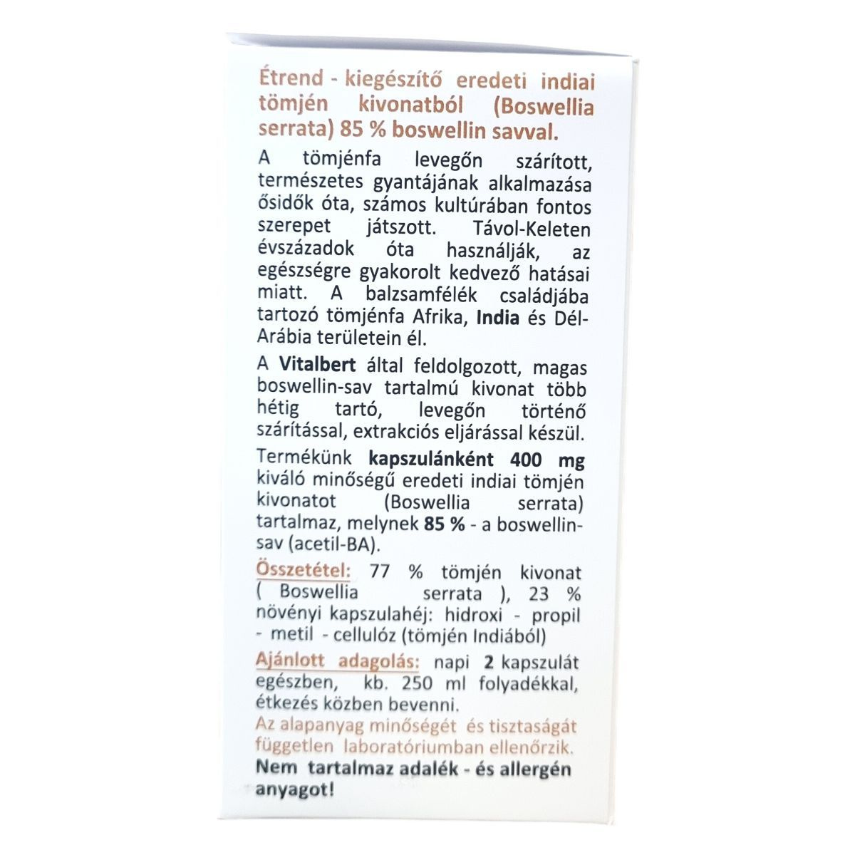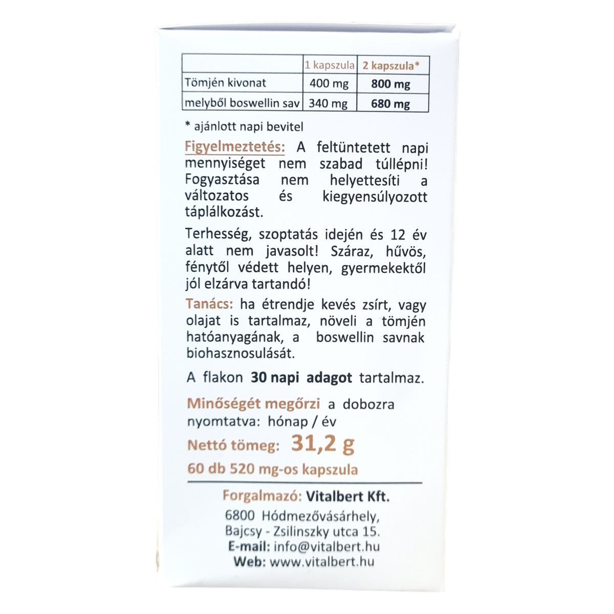 A tömjénfa levegőn szárított, természetes gyantája több kultúrában tölthetett be fontos szerepet évszázadokon át. Távol-Keleten évszázadok óta használják magas boswellin-sav tartalma és potenciális egészségre gyakorolt kedvező hatásai miatt. A balzsamfélék családjába tartozó tömjénfa Afrika, India és Dél-Arábia területein él. A Vitalbert által feldolgozott kivonat több hétig tartó levegőn történő szárítási és extrakciós eljárással készül, így biztosítva magas boswellin-sav tartalmát. A termék kapszulánként 400 mg kiváló minőségű eredeti indiai tömjén kivonatot tartalmaz, amely 85%-ban boswellin-sav (acetil-BA). A flakon 30 napi adagot tartalmaz. A termék nem tartalmaz tartósítószert, színezéket vagy más adalék- és allergén anyagot, és nem téveszthető össze a gyanta őrleményével, melyben az acetil-BA alig van jelen. Fogyasztáskor javasolt, hogy étrendje elegendő zsírt vagy olajat tartalmazzon a boswellin-sav jobb biohasznosulása érdekében.