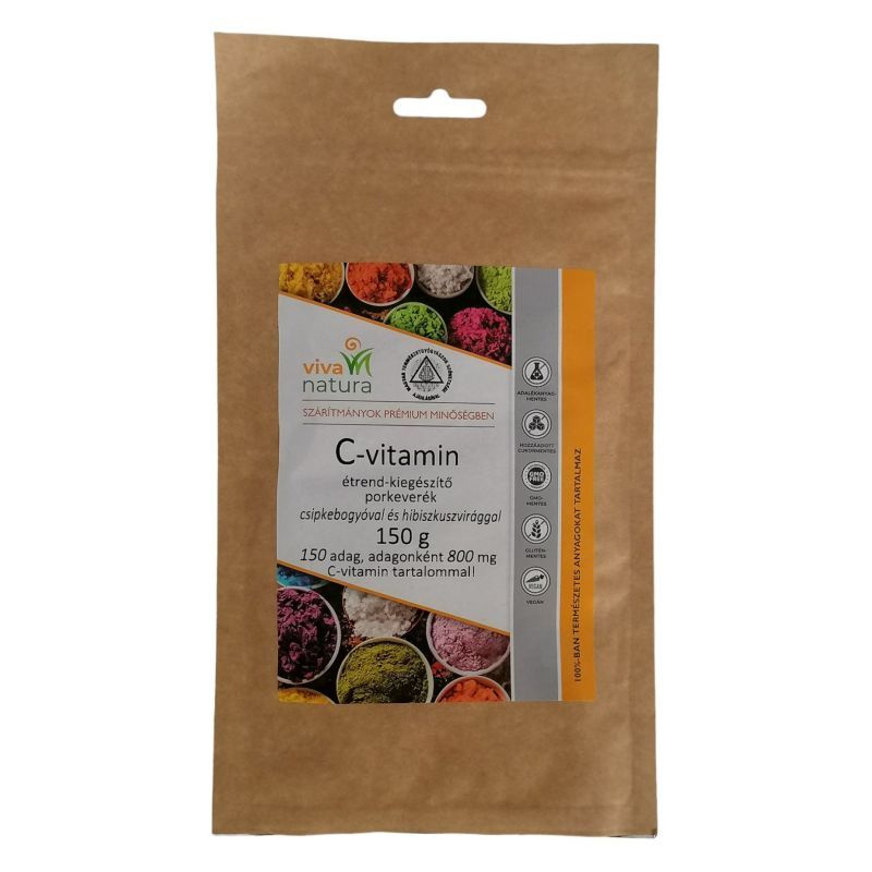 Felhasználási javaslat: 4 púpozott mérőkanál (1000mg) porkeverék 2,5 dl folyadékban elkeverve. Nyomokban búzafüvet, rozskorpát, zabfüvet, zellergyökeret, mustármagot, spenótot és zöldkagylót tartalmazhat. Napi adag tartalma (4 mérőkanál): C-vitamin: 800mg, RDA%: 1000%. RDA%: felnőttek számára ajánlott napi bevitel %-ban. Összetétel: C-vitamin (L-aszkorbinsav)(80%), csipkebogyó hús (10%), hibiszkusz virág (10%).