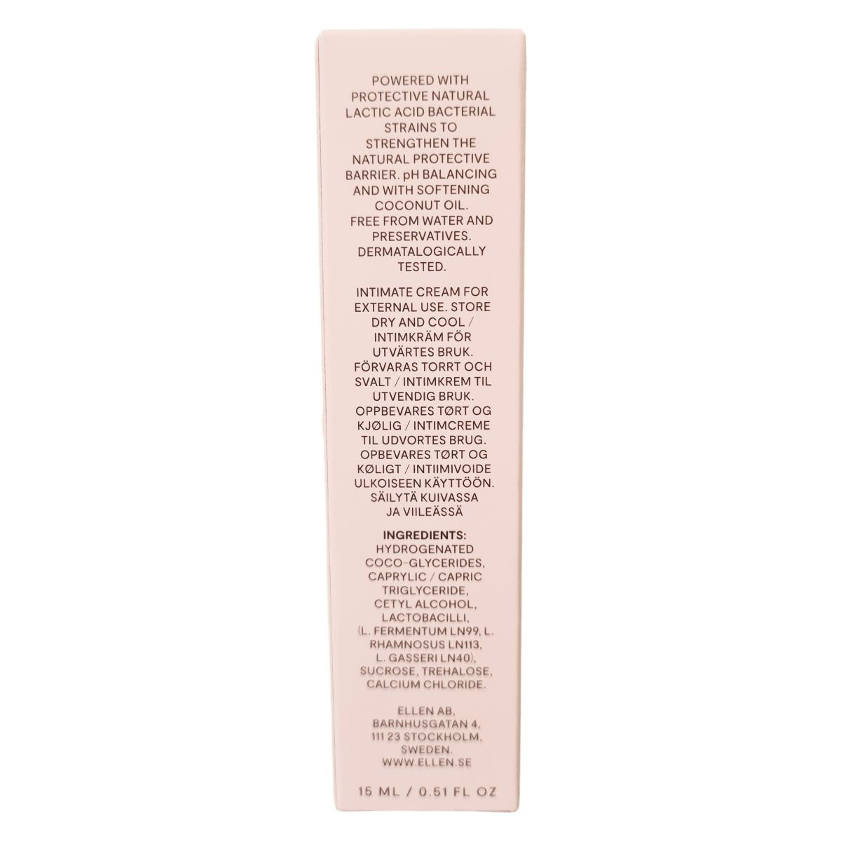 A Probiotic Intimate Cream probiotikus intimápoló krém, amely természetes tejsavbaktérium-törzsek segítségével támogatja az intim terület védőrétegét. Az angol szöveg hangsúlyozza, hogy a krém pH-kiegyensúlyozó, kókuszolaj-alapú, víz- és tartósítószermentes, dermatológiailag tesztelt, és kizárólag külső használatra alkalmas. A termék hűvös, száraz helyen tárolandó. A csomagoláson több skandináv nyelvű felirat is olvasható, amelyek mind ugyanazt a tárolási és használati útmutatót ismétlik. A krém illatanyagmentes, 15 ml-es kiszerelésben kapható.