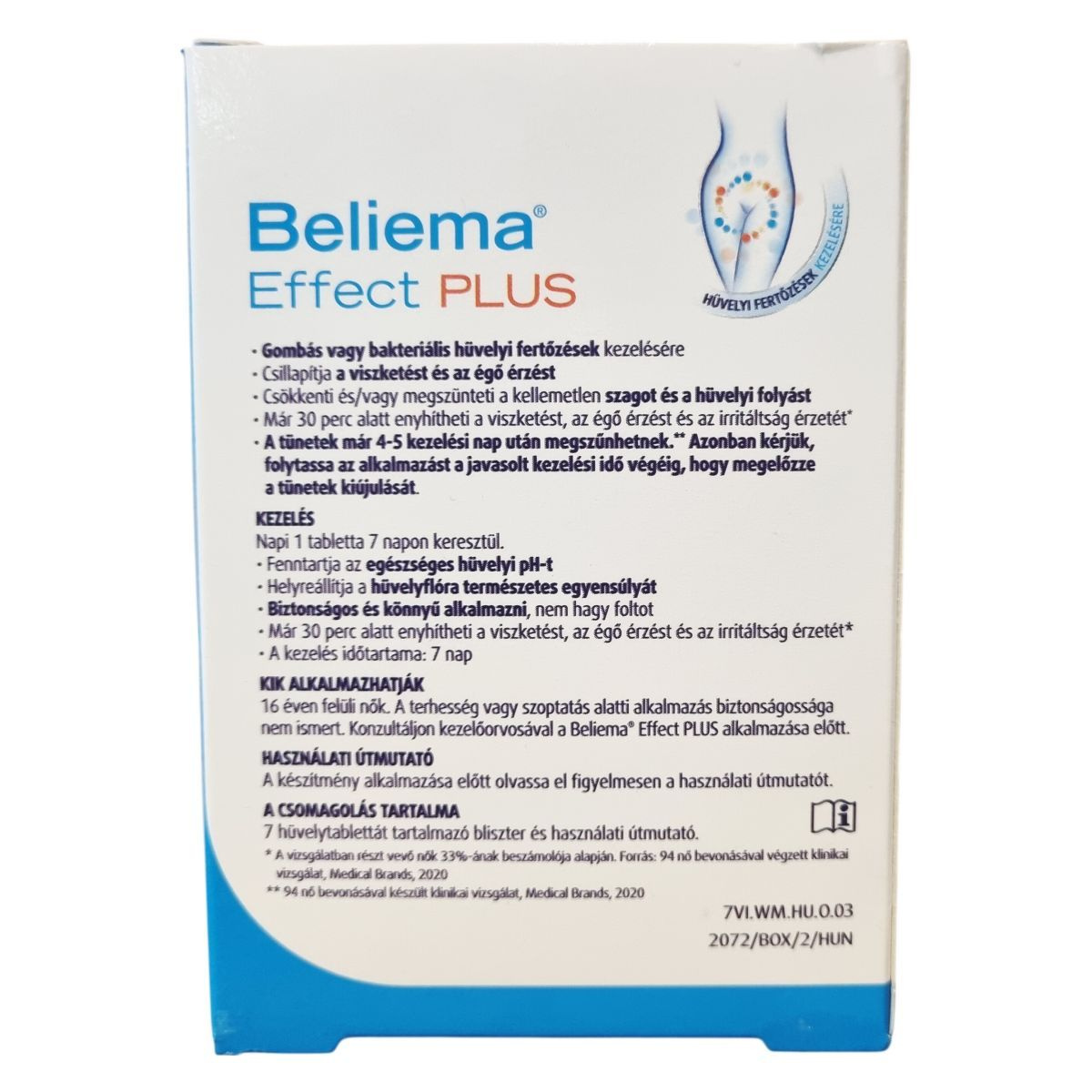 A Beliema® Effect PLUS egy orvostechnikai eszköz, amely 7 hüvelytablettát tartalmaz. Ez a termék kifejezetten a gombás vagy bakteriális hüvelyi fertőzések kezelésére készült, és a tünetek enyhítésében nyújthat segítséget, beleértve a viszketés és égő érzés csillapítását, a kellemetlen szag és hüvelyi folyás csökkentését vagy megszüntetését. A készítmény már 30 perc alatt enyhítheti a tüneteket, és a klinikai vizsgálatok szerint a nők jelentős része 4-5 napos kezelést követően tapasztalhatja a tünetek megszűnését. A kezelés során a hüvelytabletta támogatja a hüvelyi pH értékének fenntartását és a hüvelyflóra természetes egyensúlyának helyreállítását. A készítmény biztonságos és könnyen alkalmazható, nem hagy foltot. Alkalmazása 16 éven felüli nők számára javasolt, azonban terhesség vagy szoptatás időszakában a biztonságosság nem ismert, ezért ilyen esetben orvosi konzultáció ajánlott. A csomagolás használati útmutatót is tartalmaz a helyes alkalmazás érdekében.