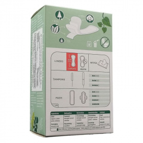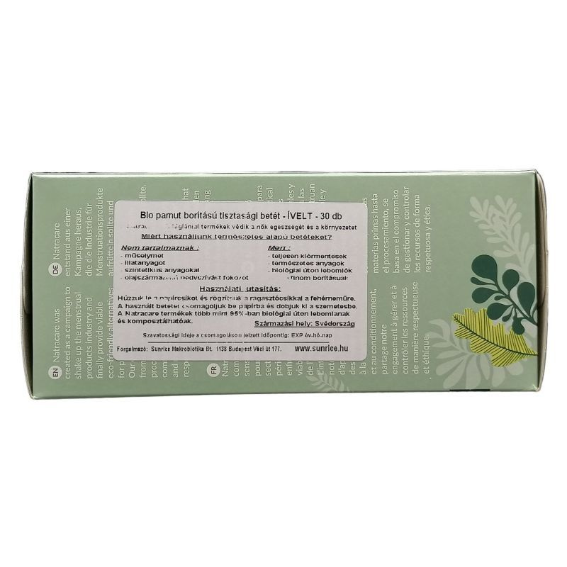 Természetes anyagokból előállított, teljesen klór- és adalékanyag mentes tisztasági betét.