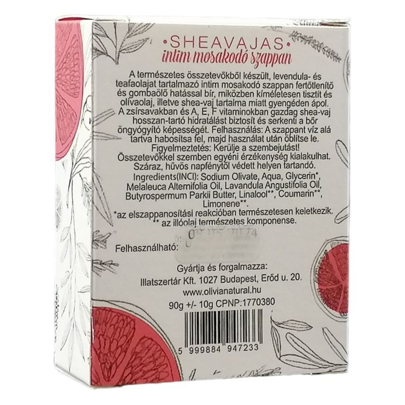 Az Olivia Natural egyedülálló, levendula- és teafaolajat tartalmazó intim szappanja fertőtlenítő és gombaölő hatással bír, miközben kíméletesen tisztít, és olívaolaj, illetve shea-vaj tartalma miatt gyengéden ápolja a bőrödet. A zsírsavakban és A, E, F vitaminokban gazdag shea-vaj hosszantartó hidratálást biztosít, illetve serkenti a bőröd öngyógyító képességét.