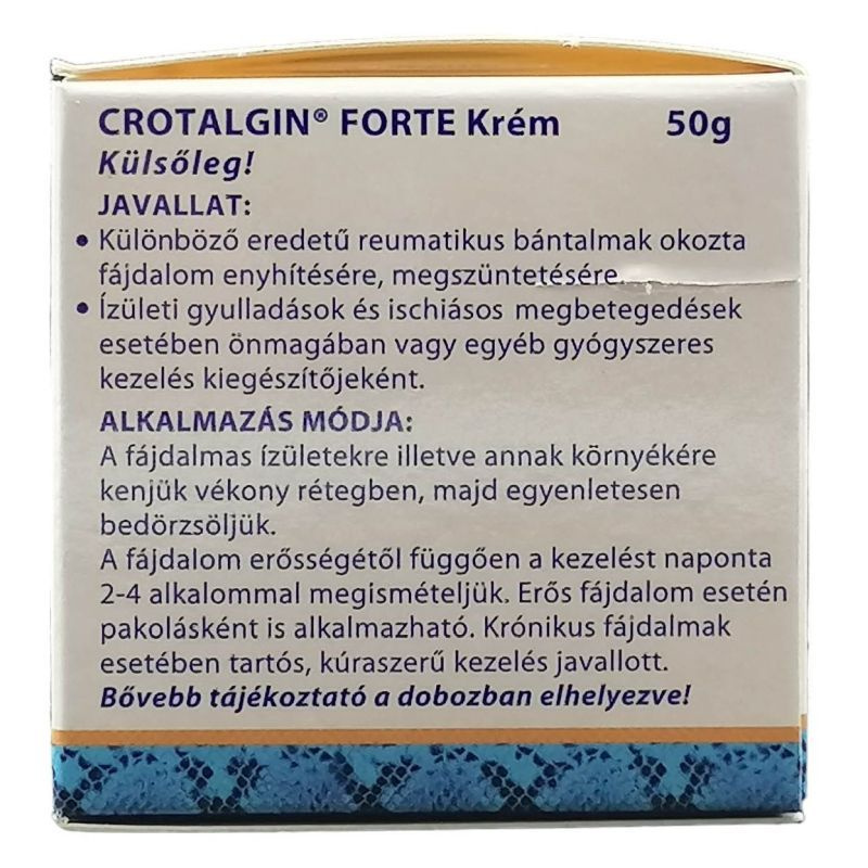 A Crotalgin forte krém recept nélkül kapható, egyedülálló összetételű készítmény, mely reumás és izomfájdalmak esetén lehet jó hatással. Sportolóknál helyi vérbőséget okozó hatása miatt bemelegítő krémként, valamint húzódások kezelésére is használható.
