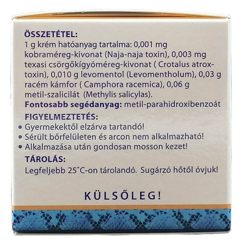 Összetétel: 1g krém tartalmaz: 0,06g metil-szalicilátot (Methylium salicylicum) 0,03g kámfort (Camphora racemica) 0,01g mentolt (Mentholum) 0,003mg texasi csörgőkígyóméreg-kivonatot (Crotalus atrox toxin) 0,001mg indiai kobra méregkivonatot (Naja naja toxin).