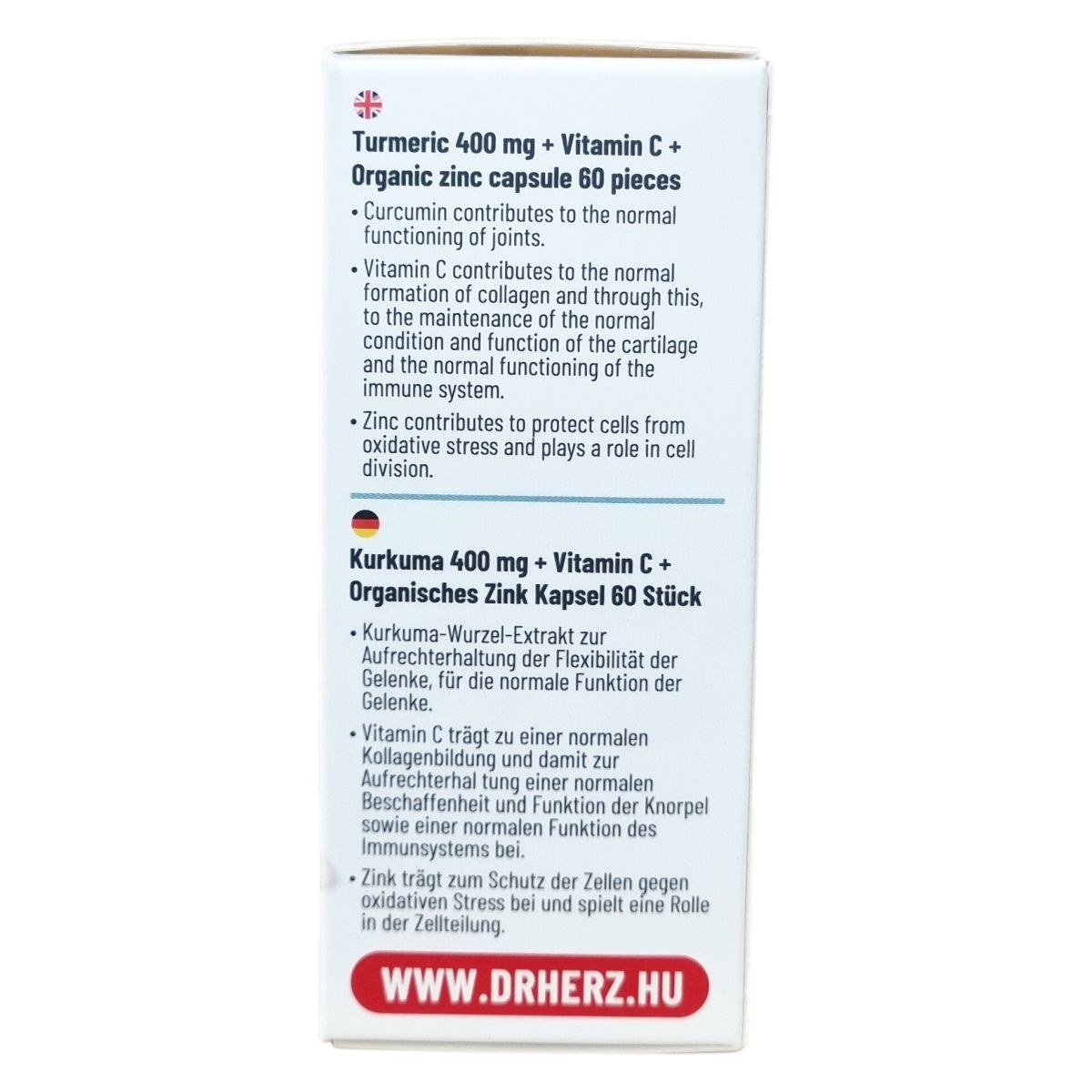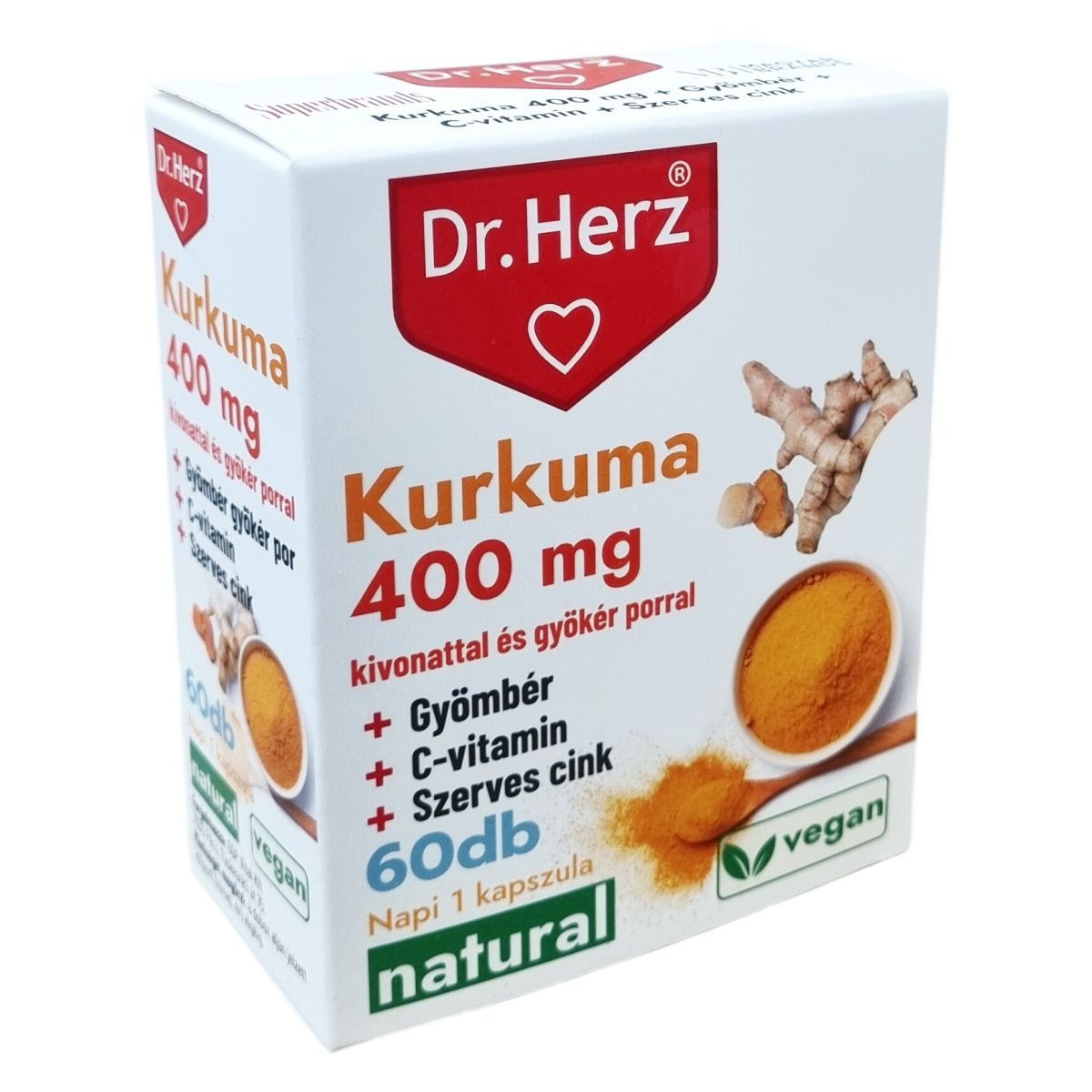 A Dr.Herz® Kurkuma 400 mg kapszula kurkuma gyökér port és kivonatot, gyömbér gyökér port, C-vitamint és jól hasznosuló szerves cinket tartalmaz. A C-vitamin hozzájárulhat a normál kollagénképződéshez, ezáltal támogathatja a porcok normál állapotának és működésének fenntartását, valamint az immunrendszer egészséges működését. A cink szerepet játszhat a normál csontozat fenntartásában, a sejtek oxidatív stresszel szembeni védelmében, valamint a zsírsavak normál anyagcseréjében. A termék természetes összetevőkkel készül, vegánok számára is megfelelő, és napi egyszeri adagként ajánlott. Nem ajánlott epeköveseknek vagy azoknak, akik epekőképződésre hajlamosak, továbbá véralvadásgátló szedése esetén orvosi tanács kérendő a fogyasztás előtt.