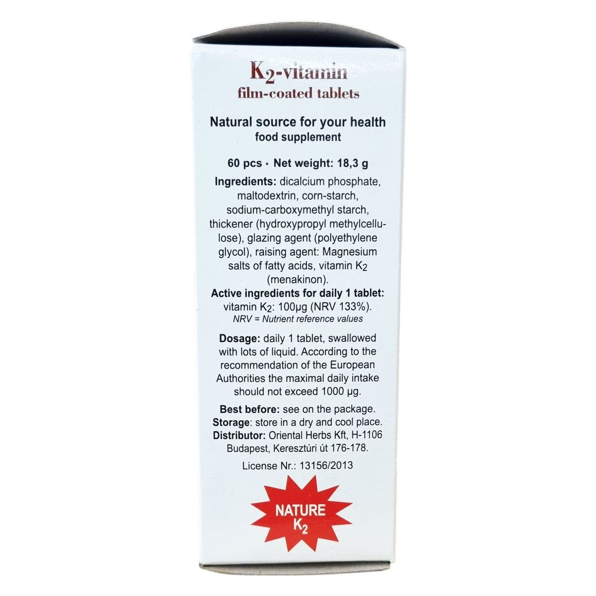 A K2-vitamin természetes formájában (menakinon) részt vehet az egészséges csontozat fenntartásában és a véralvadási folyamatokban. A vitamin néhány baktérium terméke a vastagbélben, ám az előállítása csökkenhet időskorban vagy antibiotikus kezelés során. Az étrend-kiegészítő pótlása természetes forrásból segítheti a szervezetet, különösen, ha az belső termelés csökken. A termék nem helyettesíti a kiegyensúlyozott vegyes étrendet és az egészséges életmódot. Felhívjuk a figyelmet, hogy a javasolt napi dózist nem szabad túllépni, és coumarin típusú véralvadásgátlóval egyidejűleg sem ajánlott a fogyasztása.