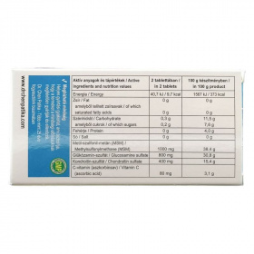 Tápérték és aktív összetevők 1 tablettában: Energia: 20,37 kJ/4,85 kcal, fehérje: 0 g, szénhidrát: 0,38 g -ebből cukor: 0,17 g, zsír: 0,034 g -ebből telített zsírsav: 0,030 g, rost: 0 g, nátrium: 0 g, glükózamin-szulfát: 316 mg, kondroitin-szulfát: 200 mg, metil-szulfonil-metán (MSM): 500 mg.