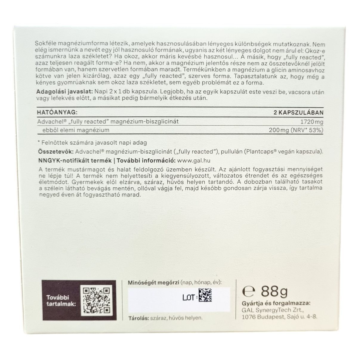 A GAL egy tiszta alapanyagokból készülő, minőségi vitaminmárka, amely a természet és az ember szimbiózisában, a fenntartható fejlődésben és a jól megélt mindennapokban hisz. A magnézium különböző formái között jelentős különbségek vannak a hasznosulás és a mellékhatások tekintetében. A termékben található magnézium kizárólag a glicin aminosavhoz kötött, „fully reacted”, szerves formában van jelen, ami tapasztalatok szerint nem okoz laza székletet vagy gyomorproblémákat még kényes gyomrúaknál sem. A kapszula cukor-, allergén-, glutén-, szója-, tejtermék-, laktóz- és GMO-mentes, vegán, és TÜV által tanúsított folyamatok előírásai szerint készül.