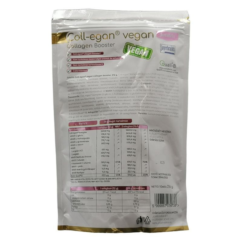 Coll-egan komplexet (L-glicin, L-hidroxiprolin, L-glutaminsav, L-alanin, L-arginin, bambusz kivonat, L-prolin, acerola gyümölcspor, karobpor) és biotint tartalmazó bogyós gyümölcs ízű kollagén italpor. Vegán készítmény, nem tartalmaz cukrot, aromát és színezéket.