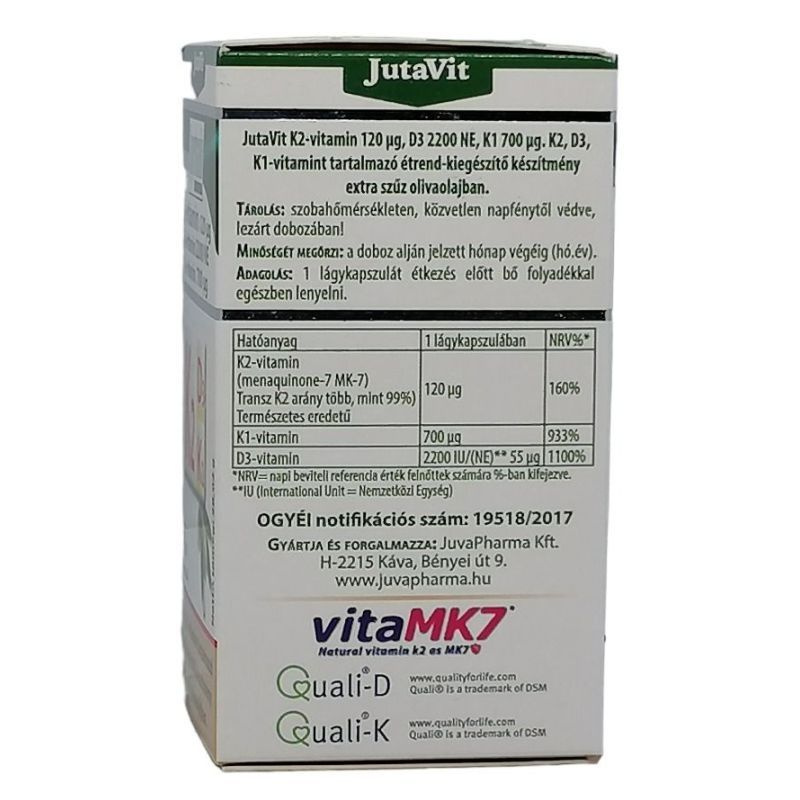 Hatóanyag 1 kapszulában: K2-vitamin (menaquinone-7 MK-7) Transz K2 arány több, mint 99%) természetes eredetű: 120 µg, K1-vitamin: 700 µg, D3-vitamin 2200 IU/(NE): 55 µg.