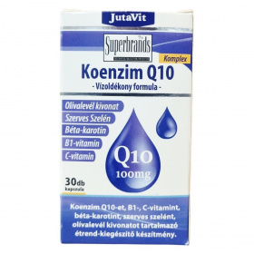 A JutaVit Komplex Koenzim Q10 kapszula egy vitaminokkal és szerves szelénnel kiegészített készítmény, amely továbbá olívalevél kivonatot és béta-karotint is tartalmaz. A termék vízoldékony koenzim Q10 formulát használ, amely 100 mg hatóanyagot biztosít egy adagban. A komplex összetétel hozzájárulhat az antioxidáns védelemhez és az általános jó közérzet támogatásához. A kapszulák száma 30 db, nettó tömegük 20,4 g. A termék szobahőmérsékleten, napfénytől védve, eredeti, lezárt csomagolásban tárolandó, és kizárólag felnőtt fogyasztóknak ajánlott az ajánlott mennyiség szerint.
