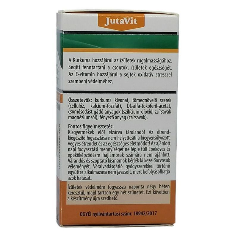 Hozzájárul az ízületek rugalmasságához. Segít fenntartani a csontok, ízületek egészségét. E-vitamin hozzájárul a sejtek oxidatív stresszel szembeni védelméhez. Adagolás: napi 1 tablettát étkezés előtt bő folyadékkal egészben lenyelni. Sok hasonló termékkel ellentétben a JutaVit Kurkuma tabletta nem egyszerűen a fűszer porított változatát (őrleményét), hanem annak KIVONATÁT tartalmazza, mely a növény értékes részének 50-szeres koncentrátuma.