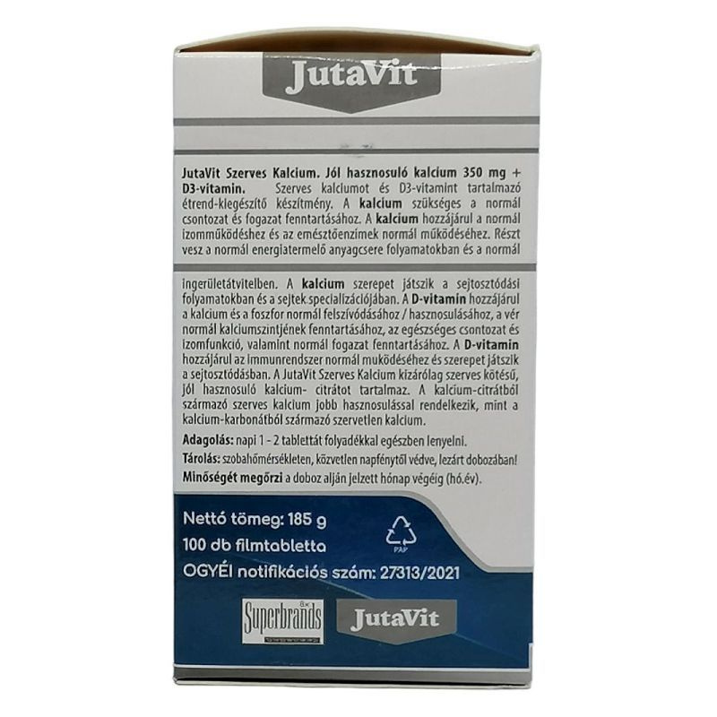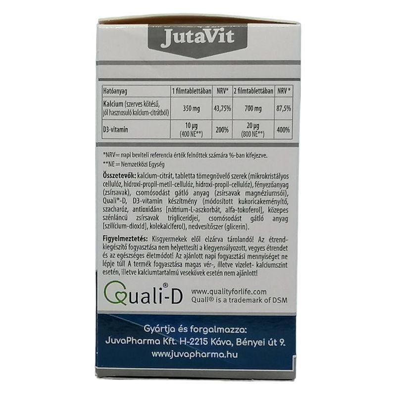 A kalcium szerepet játszik a sejtosztódási folyamatokban és a sejtek specializációjában. A D-vitamin hozzájárul a kalcium és a foszfor normál felszívódásához / hasznosulásához, a vér normál kalciumszintjének fenntartásához, az egészséges csontozat és izomfunkció, valamint normál fogazat fenntartásához. A D-vitamin hozzájárul az immunrendszer normál működéséhez és szerepet játszik a sejtosztódásban. A JutaVit Szerves Kalcium kizárólag szerves kötésű, jól hasznosuló kalcium- citrátot tartalmaz. A kalcium-citrátból származó szerves kalcium jobb hasznosulással rendelkezik, mint a kalcium-karbonátból származó szervetlen kalcium.