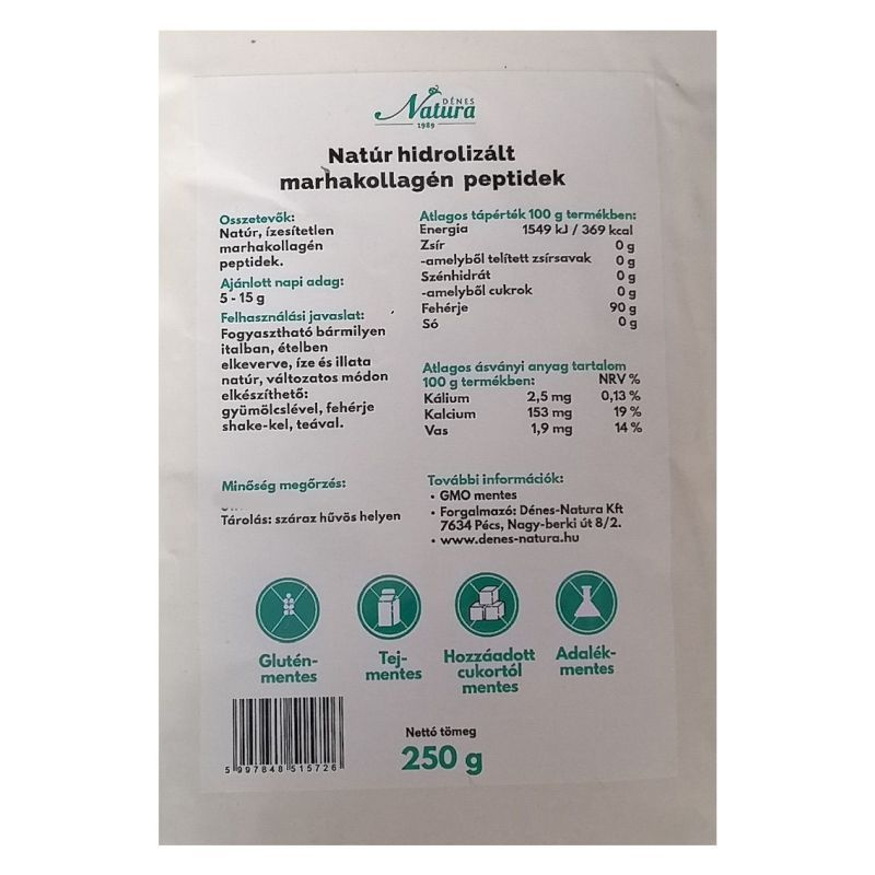 Natúr, ízesítetlen, hidrolizált marhakollagén peptidek visszazárható tasakban. 100% adalékmentes hozzáadott cukortól mentes, nem tartalmaz tartósítószert, színezéket, aromát és egyéb mesterséges anyagot.